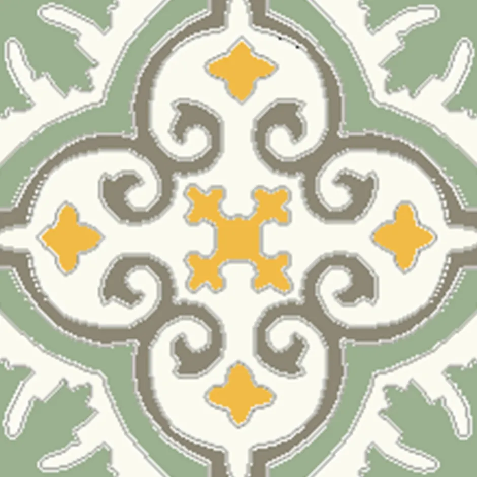 Carreaux de ciment de fabrication artisanale ; chaque carreau est fabriqué individuellement selon le prcédé traditionnel.Dim: 20 x 20 cm épais. 16 mm ; décor dans la masse épais. 5 mm.Couleurs : Blanc 48 / Gris 42 / Jaune 116 / Vert U20.Carreaux destinés pour revêtements de sols intérieurs : Cuisines, salles de bains, entrées, couloirs, salons, chambres, vérandas etc…Les carreaux de ciment sont naturellement poreux, il est conseillé de les imperméabiliser afin de les préserver de toutes taches et salissures.Conditionnement : carton de 14 pièces soit 0,56 m².Sublimez votre intérieur avec ce magnifique carreau de ciment à motif floral et géométrique, inspiré des designs traditionnels du début du XXe siècle. Ce modèle dénommé élégance, apporte une touche d’authenticité et de charme intemporel à n’importe quelle pièce.Le dessin crée un motif en étoile complexe lorsqu’il est posé, formant un quadrilobe élégant au centre de chaque carreau et des motifs de type feuilles ou rosaces aux croisements.Ce carreau se distingue par une palette de couleurs douces et harmonieuses :Une teinte apaisante avec le vert amande dominant pour les motifs de rosaces et les arcs extérieurs. Des touches de jaune ensoleillées qui animent le centre du motif et captent la lumière. Un gris discret qui dessine les volutes du motif floral, apportant finesse et contraste, et une base neutre et lumineuse avec le blanc qui met en valeur l’ensemble du dessin.Idéal pour :Salles de bains : Pour un look vintage chic.Cuisines : En crédence ou au sol, pour une ambiance « Maison de Famille ».Entrées/Couloirs : Pour un accueil chaleureux et remarquable.Terrasses couvertes : Apporte un cachet méditerranéen.