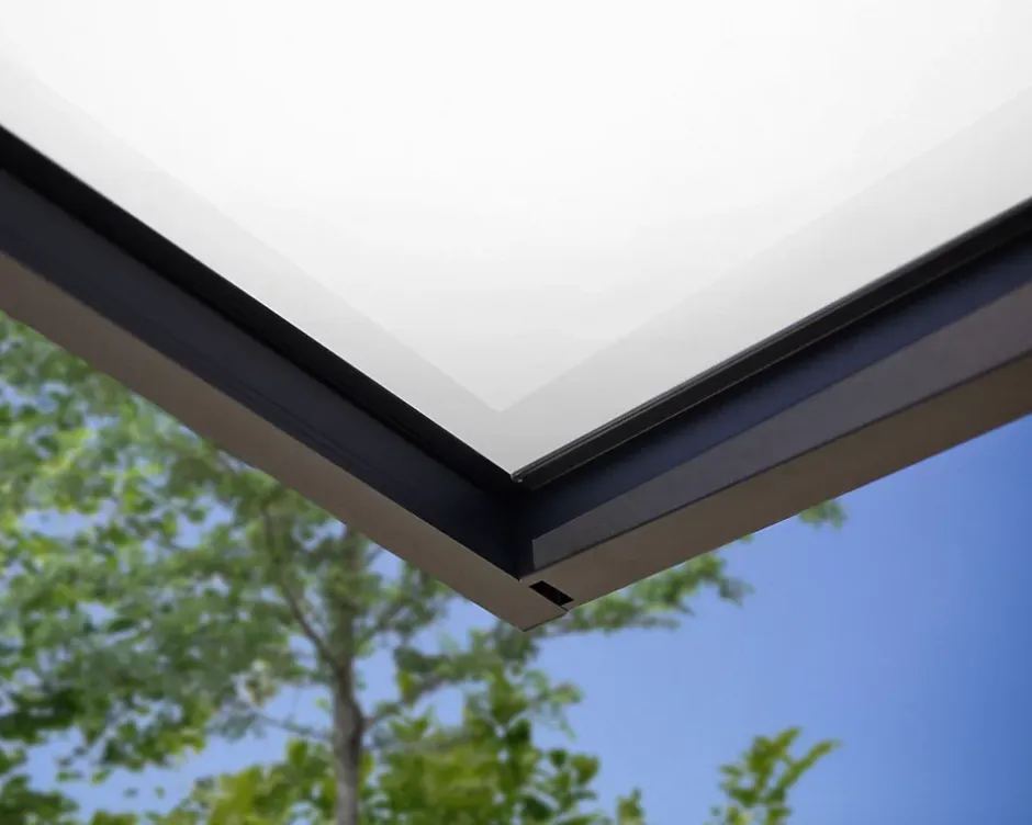 - La gouttière intégrée et dissimulée évacue l’eau de pluie sur le côté