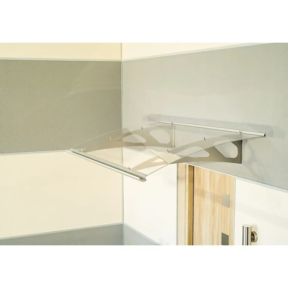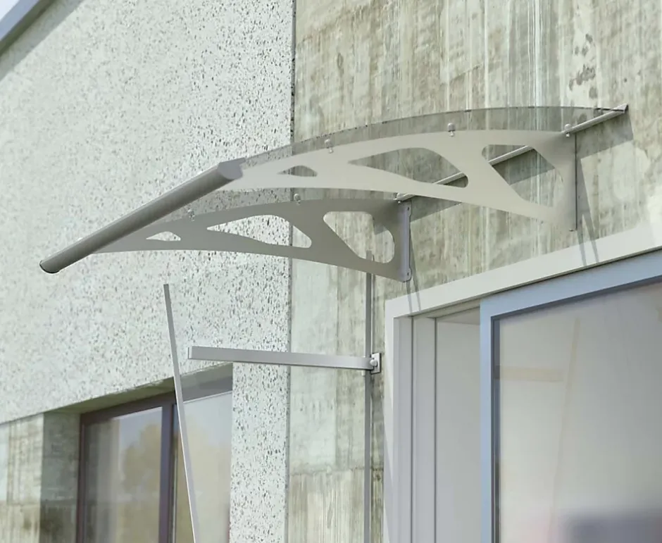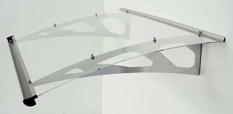 Auvent élégant et robuste, supporté par deux consoles en acier inoxydable, couvert par une plaque de PMMA, avec un joint d’étanchéité protégeant la façade côté mur et une gouttière en partie frontale.
