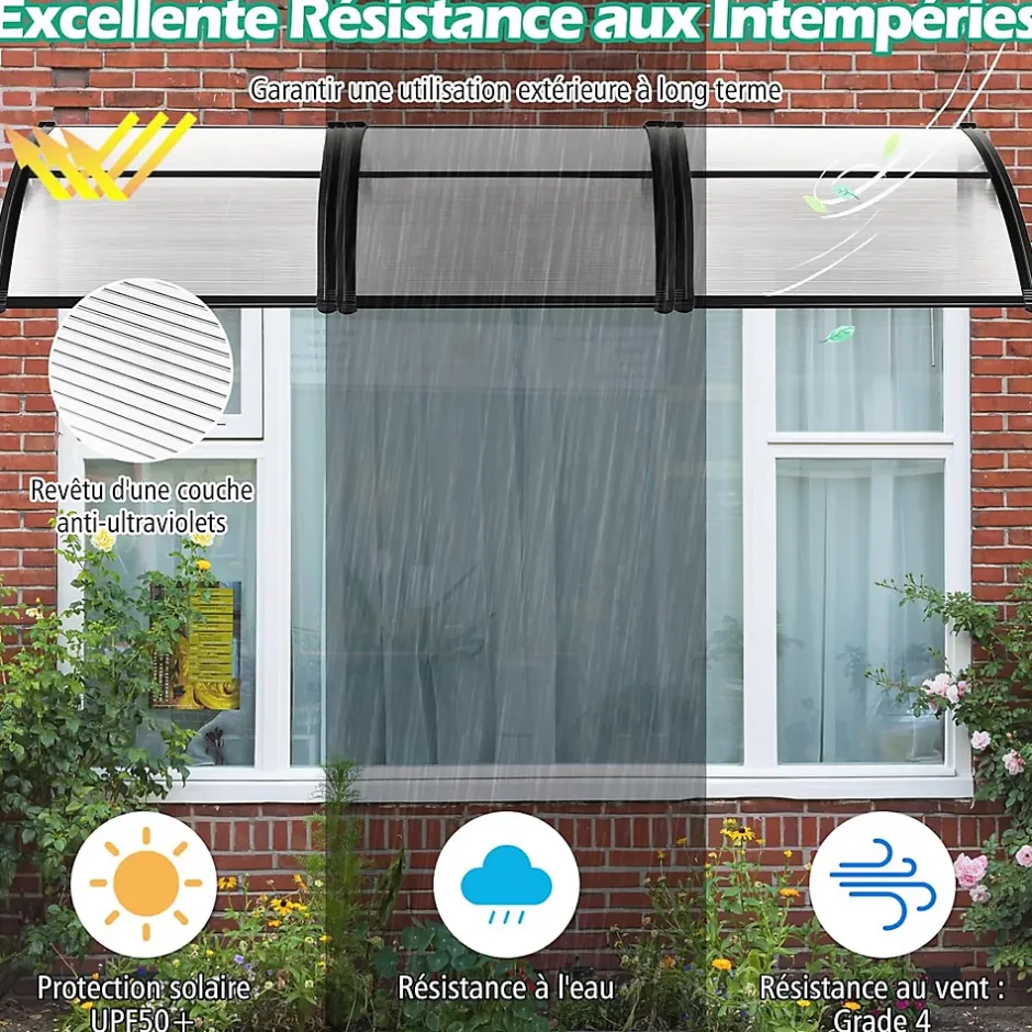 Notre auvent de porte sert d’idée parfaite contre le soleil, la pluie, la neige et le vent. Le panneau à double couche revêtu de traitement anti-UV assure une bonne résistance au soleil, et la surface sans coutures empêche les fuites d’eau tout en garantissant une forte résistance aux déchirures. La feuille en PC translucide ne rendra pas la pièce trop sombre, et les barres renforcées en aluminium permettent une structure robuste avec une capacité de poids maximale de 20 kg. Cet auvent d’extérieur convient pour des murs en ciment, des murs en bois et des murs en briques, venez l’acheter !