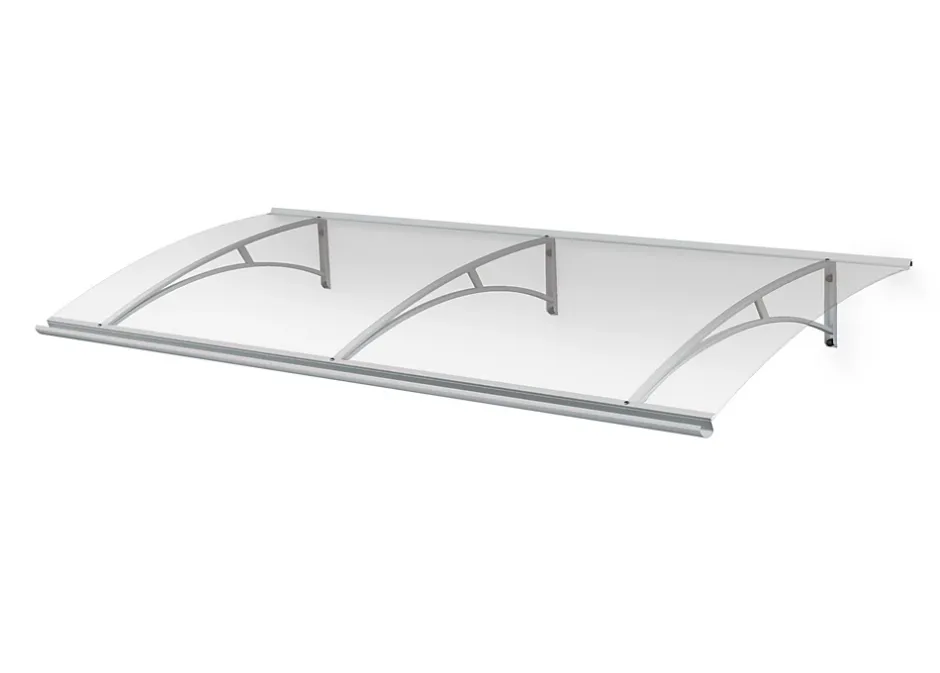 Auvent de type marquise sur trois poteaux, structure thermolaquée, couverture en plaque de PMMA transparente, équipé d’une gouttière d’évacuation et d’un joint d’étanchéité.