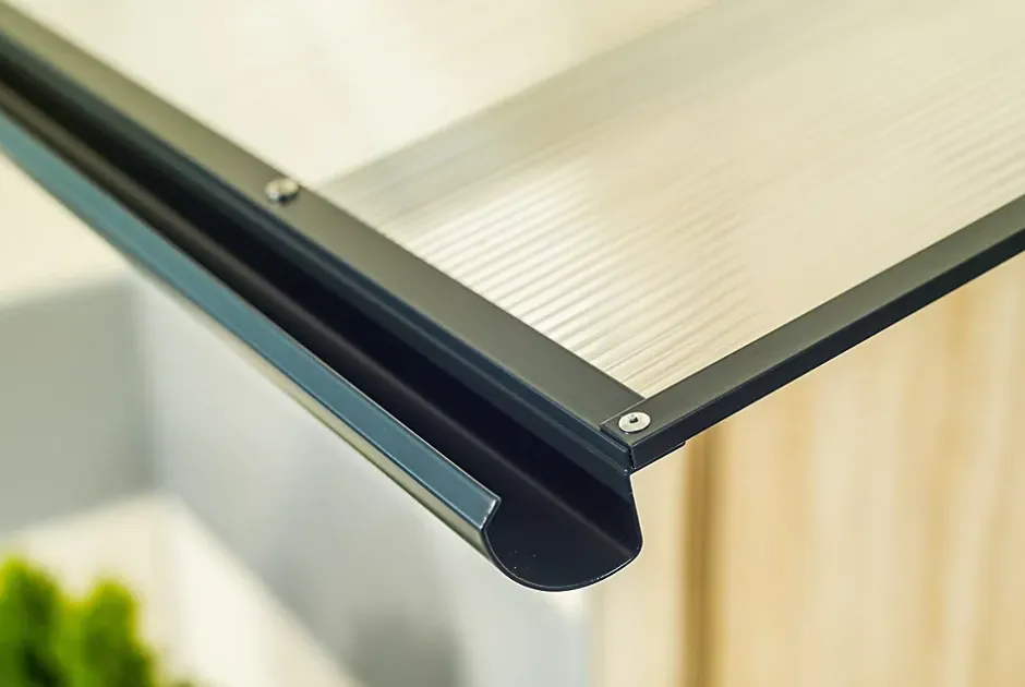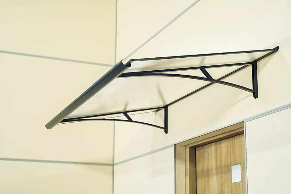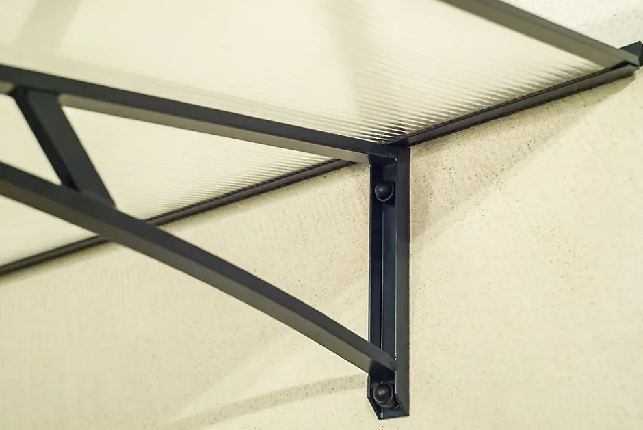 Auvent plat, structure aluminium thermolaquée supportée par deux consoles porteuses. Revêtement en plaque de polycarbonate alvéolaire avec filtre UV. Évacuation des eaux pluviales assurée par une gouttière frontale.