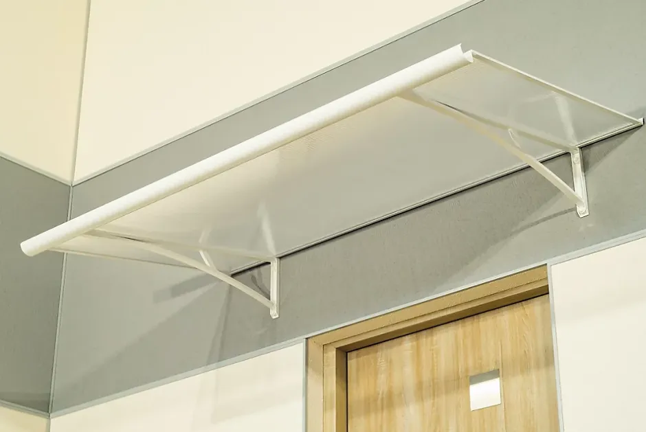 Auvent plat, structure aluminium thermolaquée supportée par deux consoles porteuses. Revêtement en plaque de polycarbonate alvéolaire avec filtre UV. Évacuation des eaux pluviales assurée par une gouttière frontale.