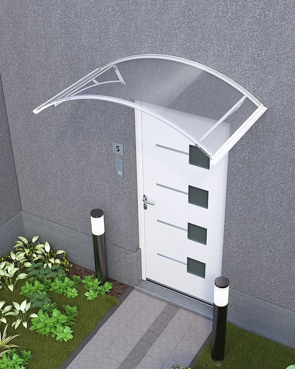 Auvent en forme d’arche, structure en aluminium thermolaqué, supporté par deux consoles, avec une couverture en plaque de PMMA transparente.