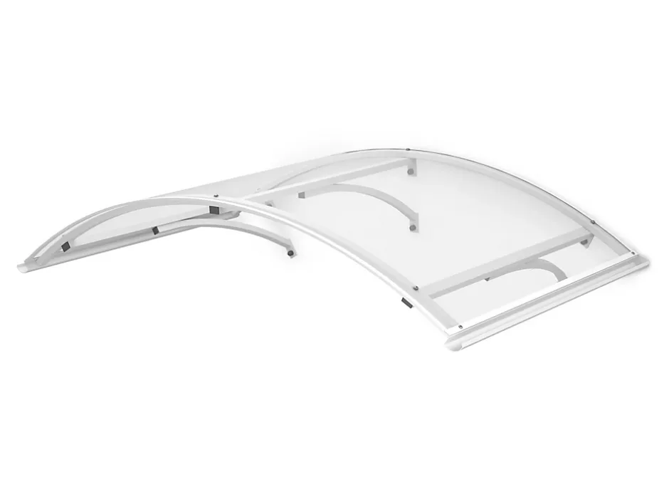 Auvent en forme d’arche, structure en aluminium thermolaqué, supporté par trois consoles, avec une couverture en plaque de PMMA transparente.