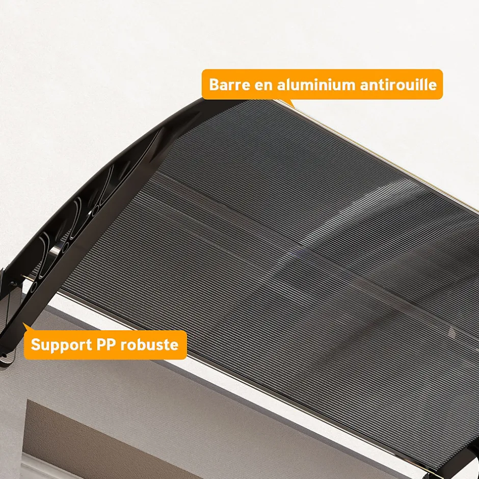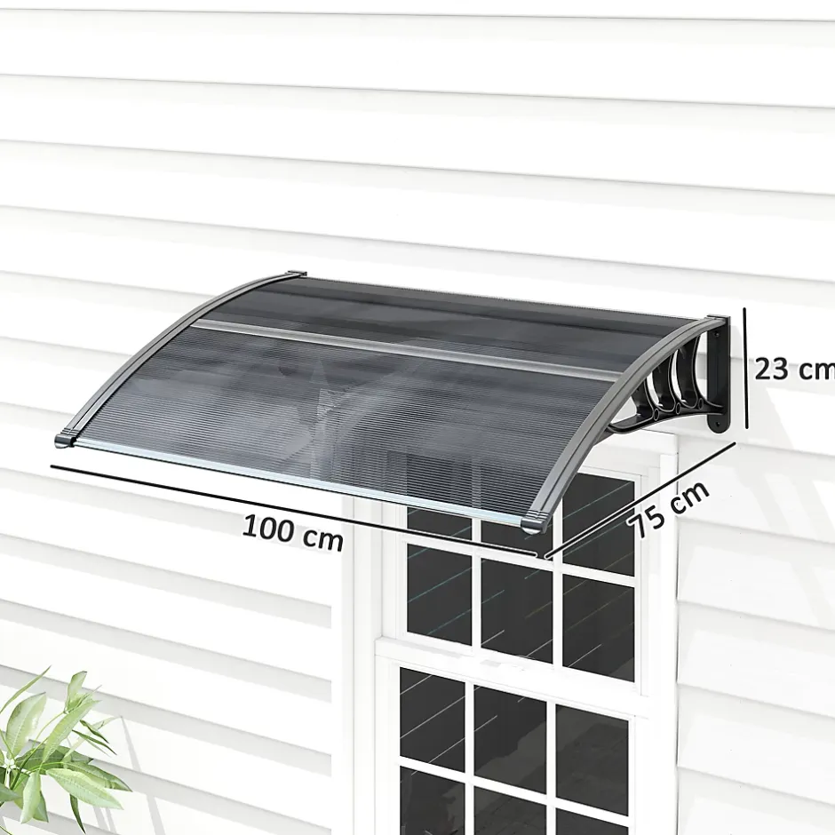 Optez pour notre marquise de porte extérieur double transparente, résistante au soleil, aux UV, à la pluie modérée et à la neige fine. Son design incurvé assure protection et confort. Installation facile sur tout mur, idéal pour portes et fenêtres. Profitez de l’extérieur en toute tranquillité avec cette solution durable.Caractéristiques :- Marquise avec panneaux en polycarbonate dotés d’une protection UV pour bloquer les rayons solaires nocifs- Support robuste en polypropylène pour une plus grande durabilité- Protège contre la neige légère et les pluies de faibles à modérées- Cet auvent de porte d’entrée comprend tous les accessoires nécessaires pour un montage mural- Idéal pour les fenêtres, les portes et les terrasses- Il est recommandé d’installer ce toit pour porte extérieure sur des murs en ciment (des vis supplémentaires pour bois sont nécessaires pour une installation sur un mur en bois)- Montage nécessaire.Spécifications :- Couleurs : transparent, noir- Matériaux : polycarbonate, polypropylène- Dimensions totales : 100L x 75l x 23H cm- Dimensions du support mural : 75L x 23H cm- Conforme à : CE-CPR- Réf. : B70-051V01BK- Note : veuillez vous assurer que votre porte ou fenêtre correspondent aux dimensions de l’auvent, montez-le au moins à 30 cm de plus haut pour éviter de bloquer l’ouverture