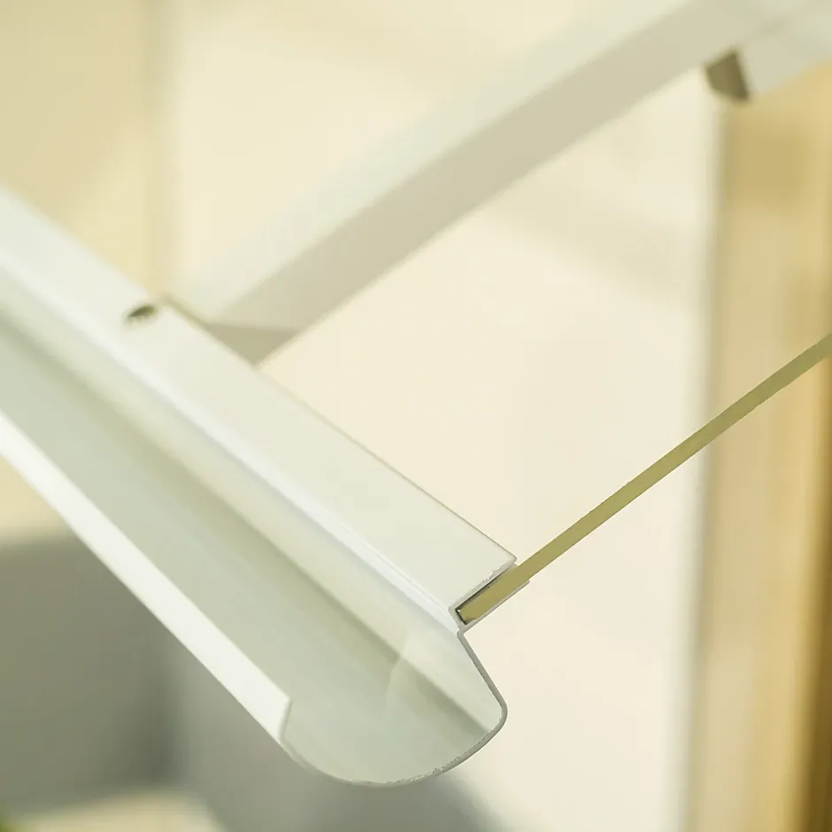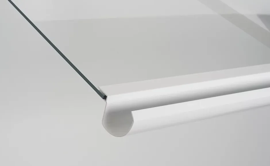 Auvent plat sur trois poteaux, structure thermolaquée, couverture en plaque de PMMA transparente, équipé d’une gouttière d’évacuation et d’un joint d’étanchéité.
