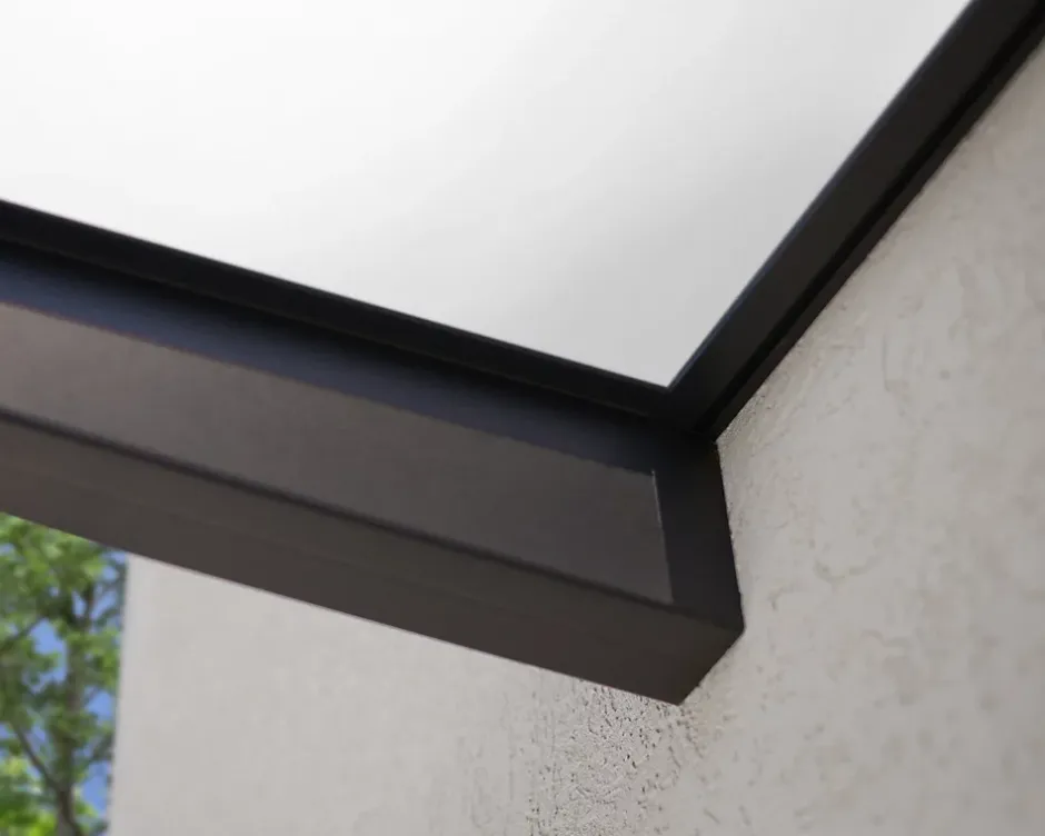 - La gouttière intégrée et dissimulée évacue l’eau de pluie sur le côté.