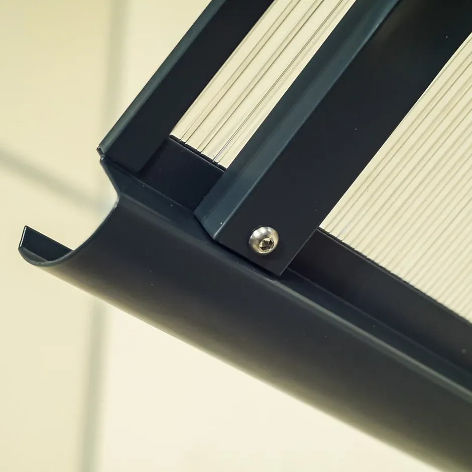Auvent cintré doté de deux gouttières latérales assurant l’évacuation efficace des eaux pluviales. Structure en aluminium thermolaqué, résistante à la corrosion. Panneau en polycarbonate alvéolaire offrant une excellente durabilité et protection contre les UV