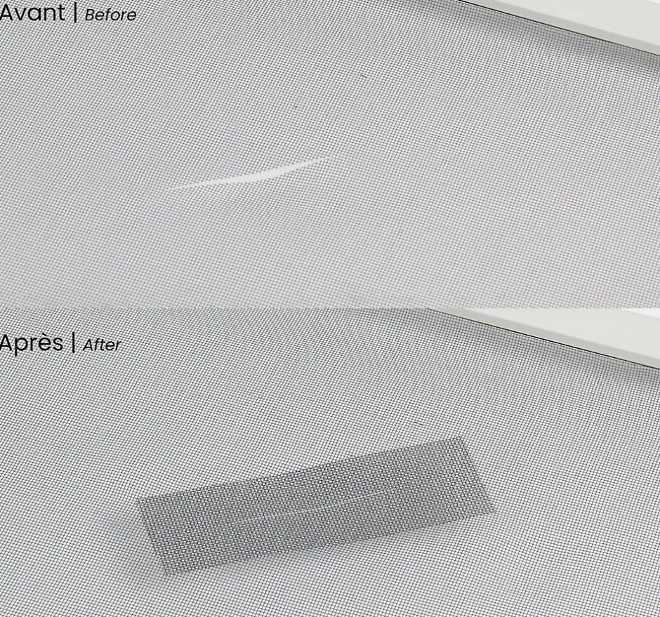 Pour réparer la toile moustiquaire griffée par le chat, découvrez le ruban adhésif moustiquaire ! Consultez-vite cette solution pas chère et efficace !Comment réparer une moustiquaire déchirée ? Votre chat a peut être endommagé votre toile moustiquaire à coups de griffes ? Il existe une solution pas chère pour refaire la déchirure et à nouveau aérer sans moustique sans tout devoir remplacer : ce ruban en fibre de verre gris maillage tous les millimètres environ. Prélevez dans le rouleau juste la longueur nécessaire pour réparer le trou. Le verso de la toile est hautement adhésif, Il suffit de le superposer contre la toile moustiquaire en place, quel qu’elle soit. Vous voilà tranquille !NB: la superposition des toiles rend visible le patch. Il s’agit néanmoins d’une solution d’appoint efficace qui permet de profiter plus longtemps de sa toile moustiquaire endommagée.Rouleau vendu en 5 x 200cm – Fibre de verre grise