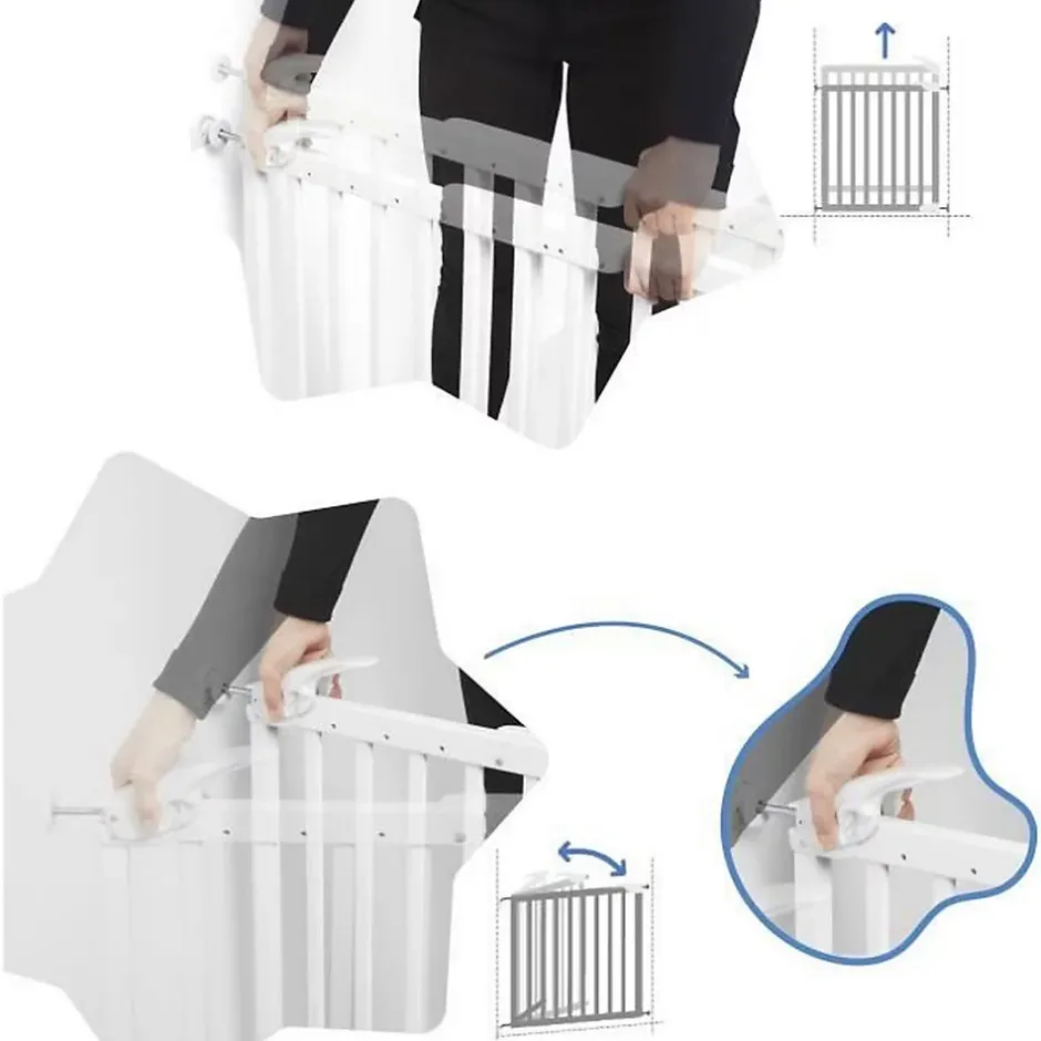 Sécurisez les escaliers et autres endroits a risques avec la barriere de sécurité BADABULLE Deco Pop Blanc.2 types de fixation et ouverture possibles : Ouverture en portillon grâce a la fixation murale avec vis ou barriere completement amovible,avec la fixation pression (la barriere ne s’ouvrira alors pas en portillon) – Extensible : pour ouvertures entre 63 et 106cm – Pas besoin d’extensions en plus – Ouverture facile avec poignée de sécurité (si fixation vis utilisée) – Pas de barre au sol qui évite les chutes – Garantie a vie – Conforme aux exigences de sécurité