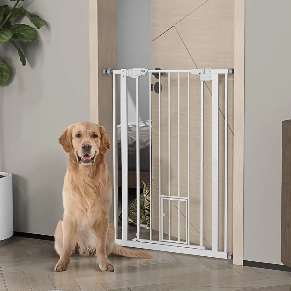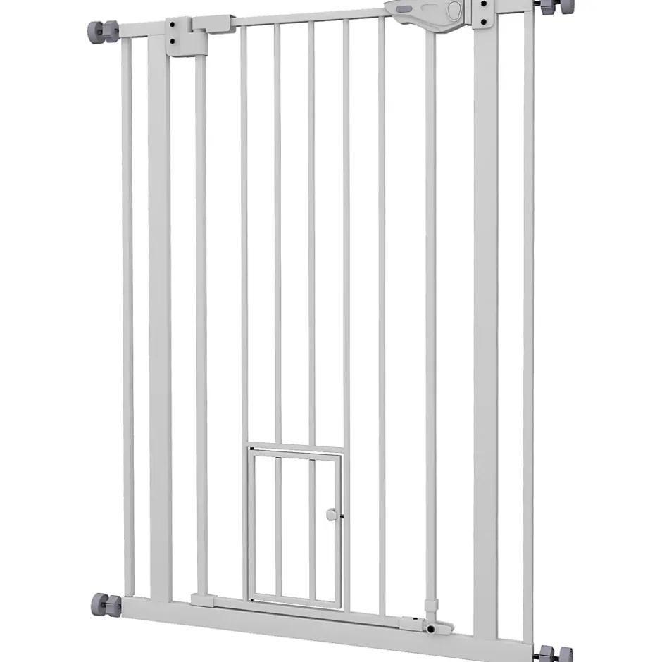 Cette barrière de protection est idéale pour portes et escalier d’une largeur comprise entre 74 et 80 cm. Elle vous permettra d’offrir un maximum de sécurité pour votre animal. Cette barrière de protection en acier se fixe par simple pression entre les cloisons ou encadrement de porte. Aucun perçage ni vissage requis. À noter que cette barrière de sécurité est équipée de 2 portes verrouillables (une grande, une petite) adaptées pour chien et chat.Caractéristiques :- Barrière de protection idéale pour les animaux domestiques, afin de les empêcher d’accéder aux pièces ou espaces de votre maison- Barrière de sécurité équipée de 2 portes verrouillables (une grande, une petite) adaptées pour chien et chat- Fabriquée en acier et plastique robuste, durable- Idéale pour une installation dans les encadrements de porte et en bas des escaliers- Compatible avec des ouvertures d’une largeur comprise entre 74 et 80 cm- Le cadre en U à fixation par pression 4 points permet une fixation ferme- Système d’ouverture à double sens, système de double verrouillage de la grande porte, simple verrouillage de la petite porte : sécurité optimale- Hauteur de 1,04 m idéale pour éviter que votre animal ne passe par dessus- Montage facile et rapide : aucun perçage ni vissage requis- Note : barrière à installer sur les encadrements de la porte ou le mur- Recommandation : bien mesurer votre ouverture avant achatSpécifications :- 2 coloris au choix : noir ou blanc- Matériaux principaux : acier, plastique- Dim. totales : 74-80L x 104H cm- Dim. petite porte : 16L x 25,8H cm- Écartement des barreaux : 5 cm- Livraison effectuée en un colis- Réf. : D06-124/124V00WT