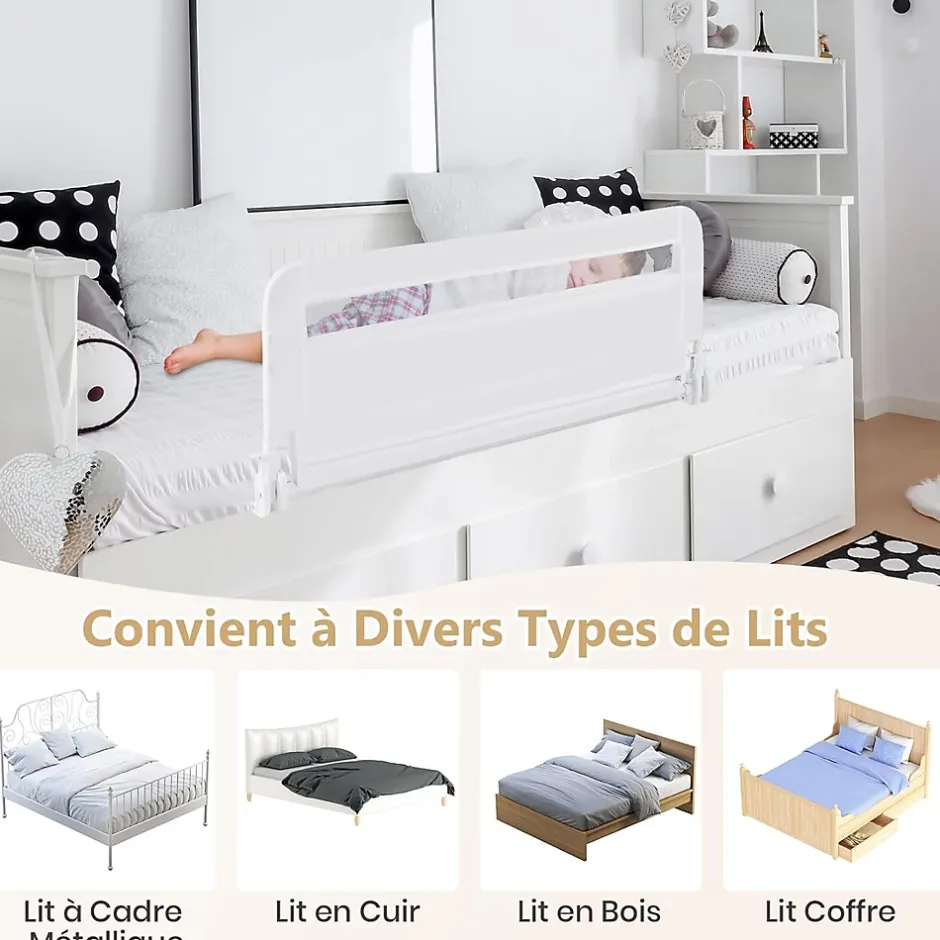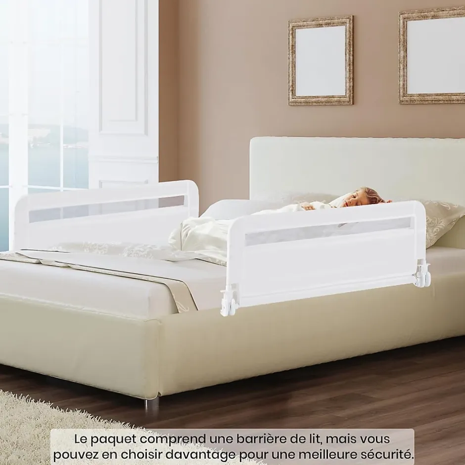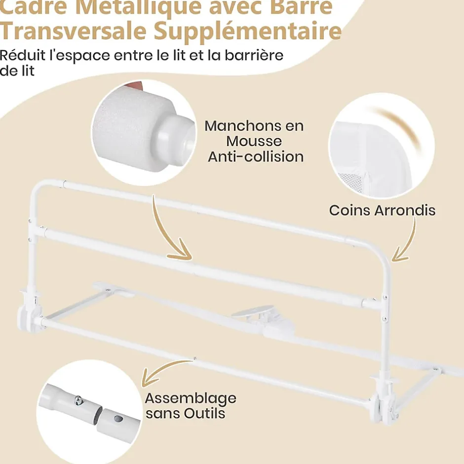 La structure métallique robuste combinée à une barre enveloppée dans une mousse antichoc, assure une stabilité sans tremblements. La maille respirante permet aux parents de vérifier l’état du bébé à tout moment. La barrière rabattable facilite l’accès. La housse dotée d’une fermeture éclair est facile à retirer pour le lavage. Elle est compatible avec plusieurs types de lits, et vous pouvez choisir le nombre d’unités en fonction de la taille du lit.
