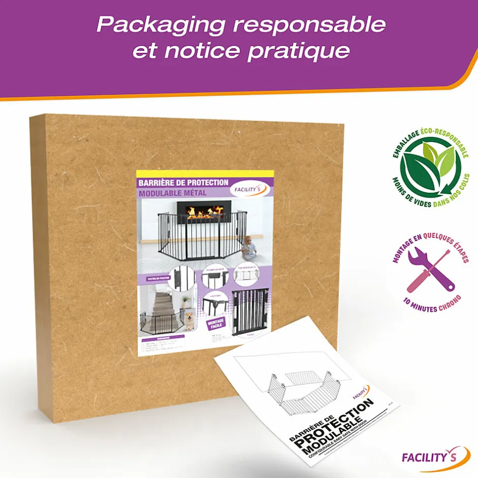 Sécurisez efficacement votre intérieur avec cette barrière de sécurité conçue pour les enfants, les bébés et les animaux. Elle est idéale pour protéger l’accès aux zones à risque telles que les escaliers, cheminées, fours, fenêtres ou toute autre zone nécessitant une protection renforcée, tout en conservant une grande flexibilité d’installation. Grâce à sa conception pliable et modulable, cette barrière se compose de 5 panneaux articulés permettant de créer différentes configurations selon votre espace. Chaque panneau mesure 60 cm, offrant une longueur maximale déployée de 305 cm. Livrée déjà montée, elle s’installe rapidement : il suffit de la déplier, de l’ajuster à la longueur souhaitée et de la fixer au mur à l’aide des supports inclus. Fabriquée en métal, cette barrière dispose d’une finition noire avec peinture résistante à la chaleur, garantissant une bonne durabilité dans le temps. Sa hauteur de 74,5 cm permet de limiter efficacement l’accès des enfants et des animaux tout en restant pratique pour les adultes. La porte intégrée est équipée d’une poignée de sécurité permettant une ouverture dans les deux sens. Stable en utilisation libre, la barrière peut également être fixée au mur pour une sécurité maximale. Elle est conforme à la norme NF EN 71-3 / 2019 EN 19-30, assurant une utilisation sécurisée pour les enfants. Cette barrière est conçue pour un usage intérieur et n’est pas recommandée pour une utilisation en extérieur.