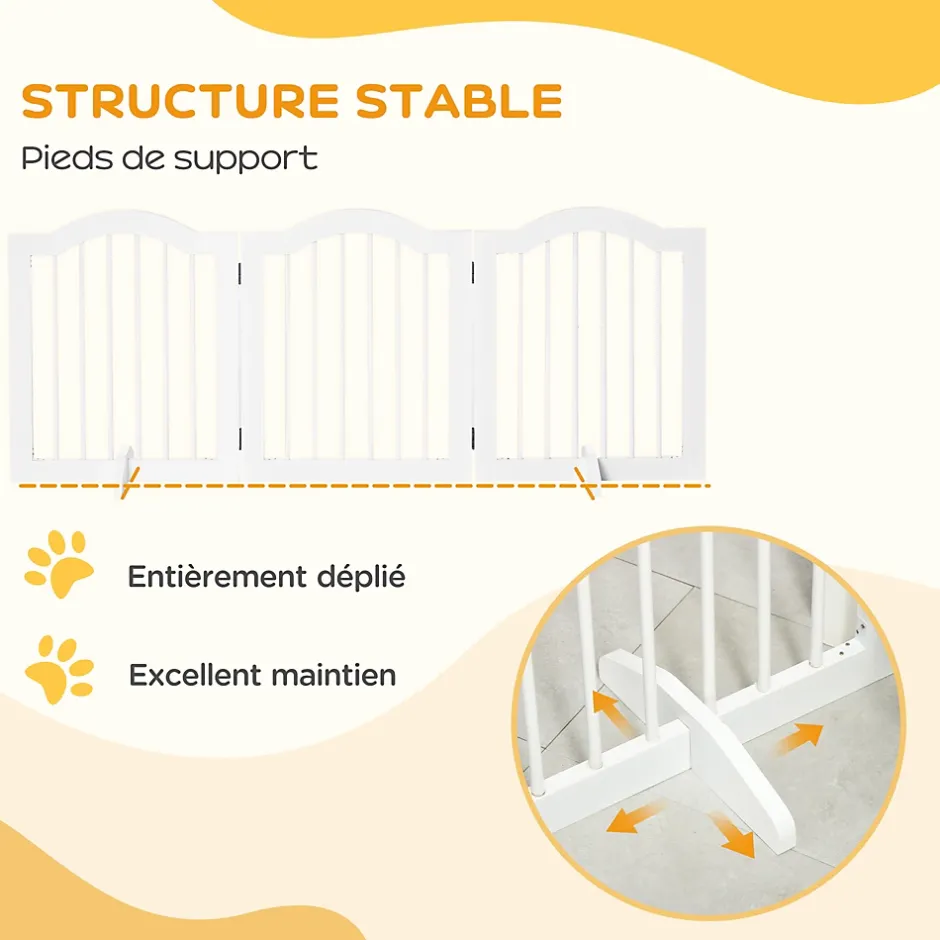 Cette barrière de sécurité pliable vous sera très pratique et vous permettra de retenir votre animal hors d’un accès ou d’une zone. Fabriquée intégralement en MDF, pouvant être étendue jusqu’à 1,54 m, cette barrière vous deviendra vite indispensable. Caractéristiques : – Barrière coloris blanc sobre et moderne en 3 panneaux avec double piètement support amovible inclus- Idéal pour protéger les escaliers, couloirs, chambres, accès avec porte de toute intrusion de votre animal- Permet d’éduquer votre animal quant aux zones autorisées- Modulable très facilement pour s’adapter à différentes tailles de portes ou d’accès- Barrière pliable et portable, rangement compact pratique si inutilisation- Patins antidérapants afin d’optimiser la stabilité de la barrière- Fabrication à partir de matériau résistant (MDF) pour un usage pérenne Spécifications : – Couleur : blanc- Matériau principal : MDF- Dimensions ouvertes : 154,5L x 61H cm- Epaisseur panneau : 1,8 cm- Taille de chaque panneau : 50,8L x 61H cm- Livraison effectuée en un colis- Réf. : D06-048V01WT