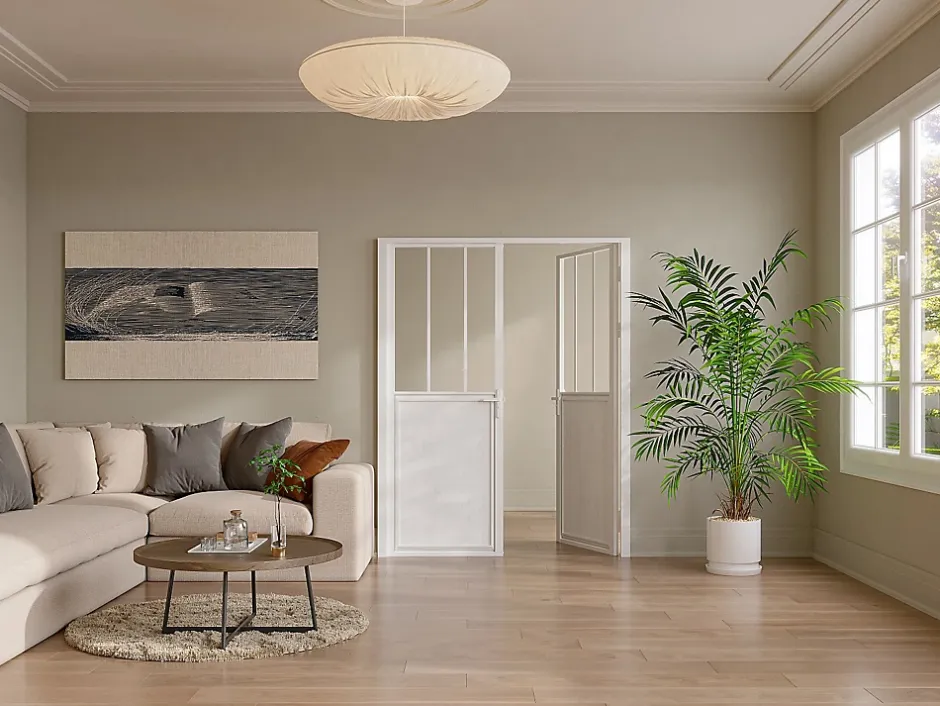 Vous souhaitez apporter une touche tendance à votre intérieur ? Optez pour le bloc porte ERMELO, avec son style atelier et ses trois vitrages il apportera de l’élégance mais également de la luminosité dans la pièce de votre choix. ERMELO est un modèle réversible, rendant donc possible son installation en poussant gauche ou droit selon vos envies et vos besoins. Besoin d’encore plus d’espace ? Choisissez l’option à double battant.2 x Porte battante atelier en aluminium et verre trempé – H204 x L83 cm – Blanc – ERMELOCaractéristiques Couleur (nuance) : Blanc Matière (précision) : Mdf, Verre trempé, Aluminium Epaisseur verre : 5 mm Epaisseur métal : 1.5 mm Finition : Lisse Type de porte : Porte simple Mécanisme d’ouverture : manuel Angle d’ouverture maximal (°) : 90 ° Equipement inclus : Visserie, Poignée Type de pose : en tunnel (ou en tableau) Sens d’ouverture : Poussant droit, Poussant gauche Utilisation : Intérieur À monter soi-mêmeDimensions Longueur : 83 cm Hauteur : 204 cm Profondeur : 3.5 cm1 x Cadre de porte double – H207.5 x 171.7 cm – Blanc – TULEARCaractéristiques Couleur (nuance) : Blanc Matière (précision) : Contreplaqué Finition : Lisse Equipement inclus : Visserie Type de pose : en tunnel (ou en tableau) Utilisation : Intérieur À monter soi-mêmeDimensions Longueur : 171.7 cm Hauteur : 207.5 cm Profondeur : 7.4 cm1 x Accessoire pour porte battante double – Blanc – ERMELOCaractéristiques Couleur (nuance) : Blanc Matière (précision) : Aluminium Type de pose : en tunnel (ou en tableau) Utilisation : Intérieur À monter soi-mêmeDimensions Longueur : 3.5 cm Hauteur : 204 cm Profondeur : 3.5 cmLivraisonLors de la livraison, il est conseillé de vérifier que le bon nombre de colis a été livré.Colis2 x Porte battante atelier en aluminium et verre trempé – H204 x L83 cm – Blanc – ERMELO2 x Colis n°1 : Longueur 114 cm, Largeur 82 cm, Hauteur 10 cm, Poids 25 kg. 1 x Cadre de porte double – H207.5 x 171.7 cm – Blanc – TULEARColis n°1 : Longueur 216 cm,