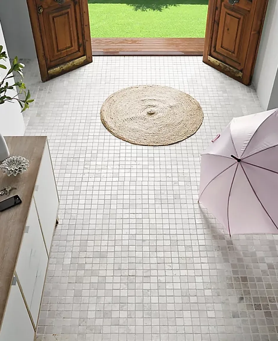 Plaque de mosaïque en marbre naturel à poser au mur ou au sol.À utiliser en tant que listel ou seule pour mettre en valeur un mur.Fragments de marbre naturel taillés à la main.Instructions d’entretien :N’utilisez pas de chiffons abrasifs ni de nettoyants corrosifs.Toujours respecter les instructions du fabricant concernant le mortier-colle et les joints de carrelage.Dimensions :- Trame : 30×30 cm- Epaisseur : entre 0,9 et 1 cmMatériaux : Marbre naturelCouleur : blancPoids : 2 kg