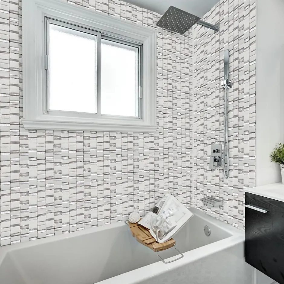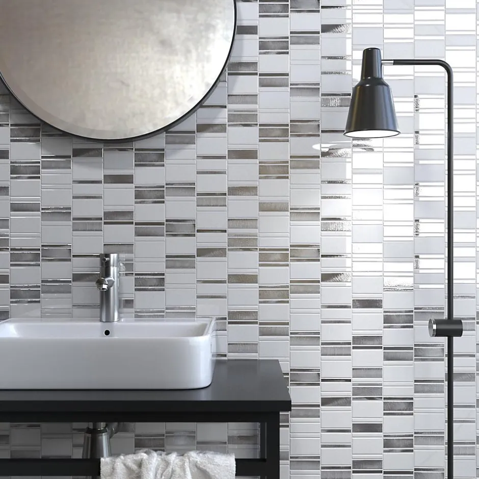 Transformez votre espace avec notre mosaïque en verre blanc et métal. Son effet uni et sa finition brillante ajoutent une touche chic à votre cuisine ou salle de bain.