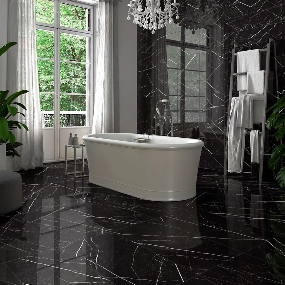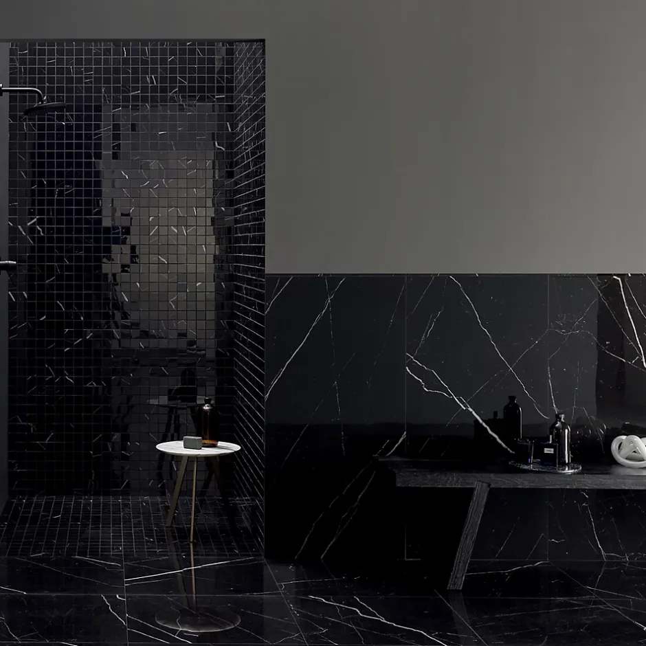 - Le marbre noir est l’emblème reconnu du luxe par excellence. Les veines blanches lumineuses décorent une base noire intense et reproduisent fidèlement le marbre naturel, avec les avantages du grès cérame