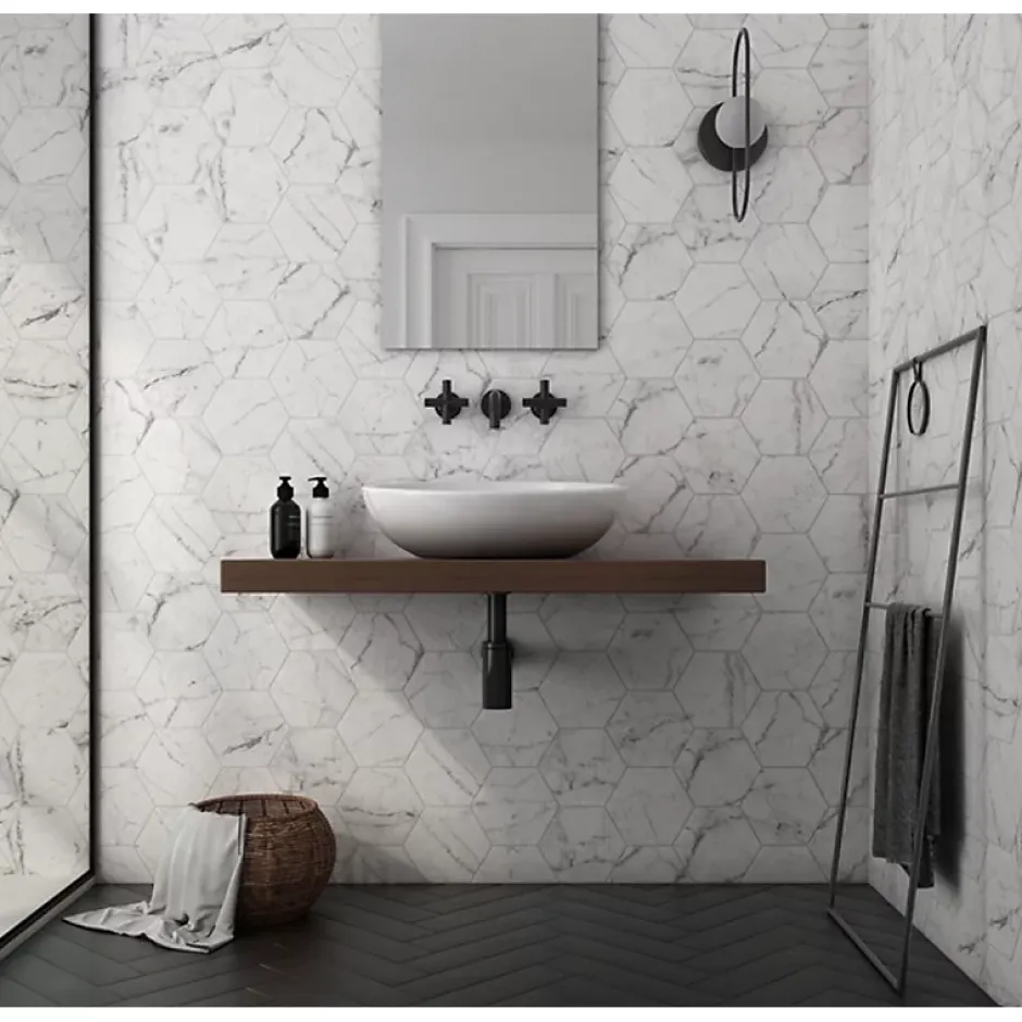 Matière: Grès cérame Dimensions: 17,5 x 20 cm Usage : Intérieur & Extérieur (Terrasse couverte) Destination: Sol & Mur Finition: Mate R9 – A Rectifié: Non Epaisseur: 8 mm Nuances: légères variations Existe en : 1 uni & 2 décors assortis . . Le luxe et l’élégance se rencontrent à travers chaque centimètre de ce carrelage en grès cérame, avec son motif effet marbre mate et ses design géométriques. Comme un joyau rare et précieux, chaque carreau conte une histoire de sophistication et de raffinement. L’effet marbre de ce carreau évoque la grandeur des sculptures antiques et des monuments qui ont perduré à travers les siècles. Cette collection vous est proposée dans un format hexagonal et se décline dans trois décors différents. Elle est bien plus qu’un simple revêtement mural. C’est une ?uvre majeure de l?artisanat, capable de transformer n’importe quelle pièce en un cadre luxueux. Que ce soit pour une salle de bain, une cuisine, la collection CARRARA est une déclaration de style et de sophistication moderne. . N’hésitez pas à nous contacter pour demander un échantillon. .