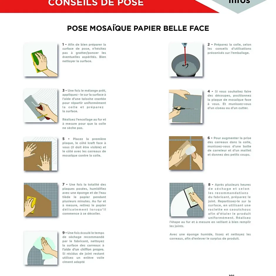 - Les mosaïques en pâte de verre sont pré-assemblées sur des trames, garantissant une installation simple et un alignement parfait, même pour les débutants.