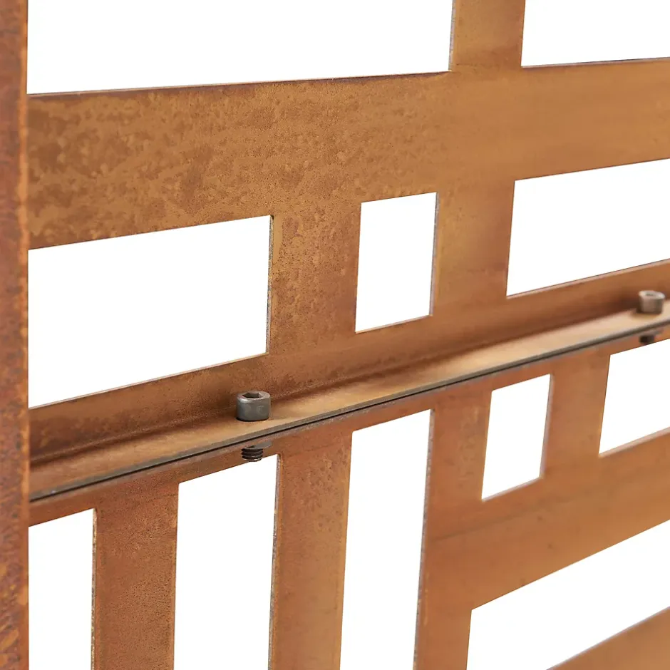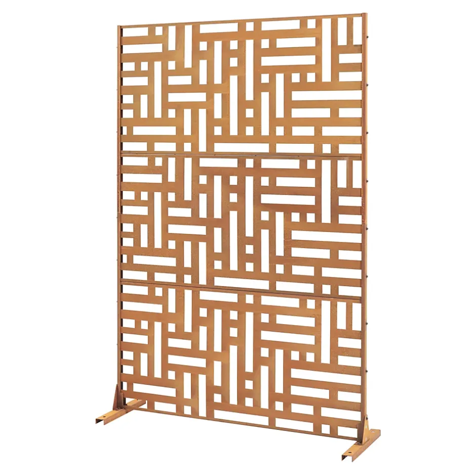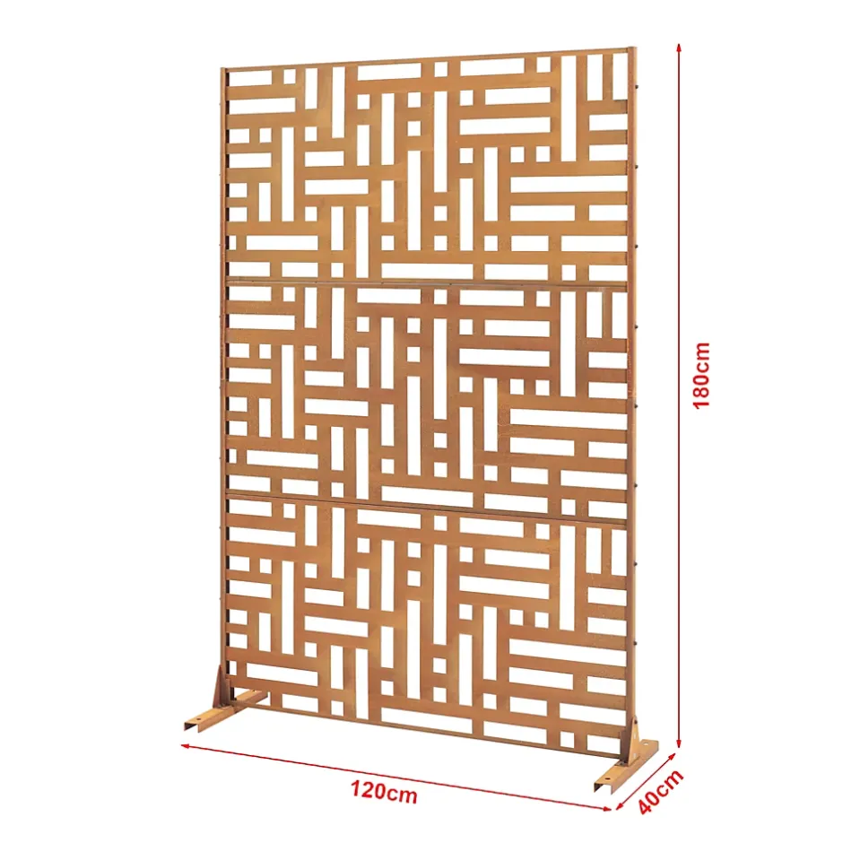 Cette cloison de séparation polyvalente s’adapte aux environnements intérieurs et extérieurs, délimite les espaces tout en protégeant du vent et du soleil, affiche un motif décoratif moderne, s’installe facilement grâce à une structure robuste et est fabriquée en acier pour une utilisation longue durée.