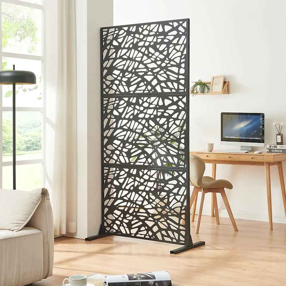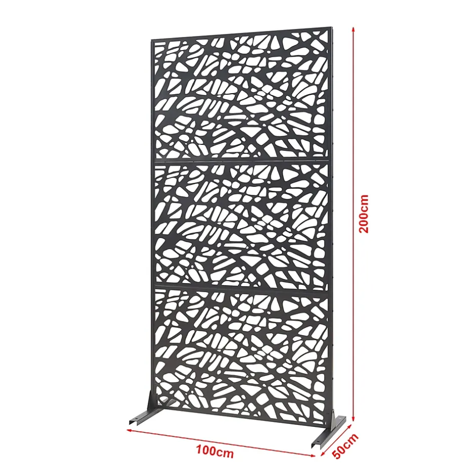 Cloison de séparationCette élégante cloison est la solution parfaite pour créer de l’intimité ou séparer différentes zones dans une pièce. Que ce soit dans le salon, le bureau ou d’autres pièces, il s’intègre parfaitement à tout environnement.Le motif décoratif de la cloison attire l’attention. Son design moderne et intemporel confère une touche de style à chaque pièce.Elle est fabriquée en métal de haute qualité avec des découpes précises qui créent un jeu d’ombre et de lumière attrayant. Elle convient parfaitement à l’aménagement d’espaces de vie et de travail modernes.Le montage de la cloison est simple et rapide. Les pieds robustes assurent une stabilité et une sécurité optimales.Points forts du produit :- séparation de pièces pour le bureau et l’habitat- idéal pour délimiter différentes zones- structure robuste pour une bonne stabilité- les découpes créent des jeux d’ombre et de lumière- le motif décoratif offre un design intemporel- montage simple et rapideDimensions :- totales (h x l x p) : 200 x 100 x 50 cm- épaisseur de la cloison : 1,5 cmMatière :acier galvaniséCouleur :noirContenu de la livraison :1 x cloison de séparationProduit de la marque :casa.pro