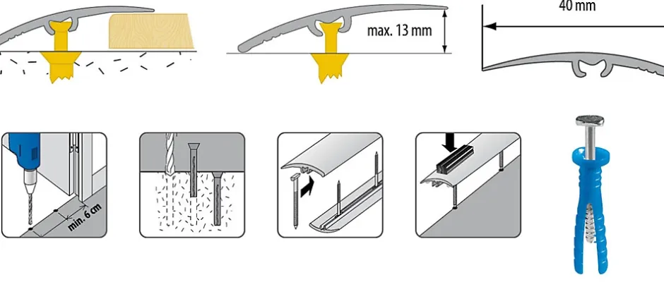 - Barre de seuil en aluminium à fixer avec des chevilles invisibles ou à coller selon le modèle.