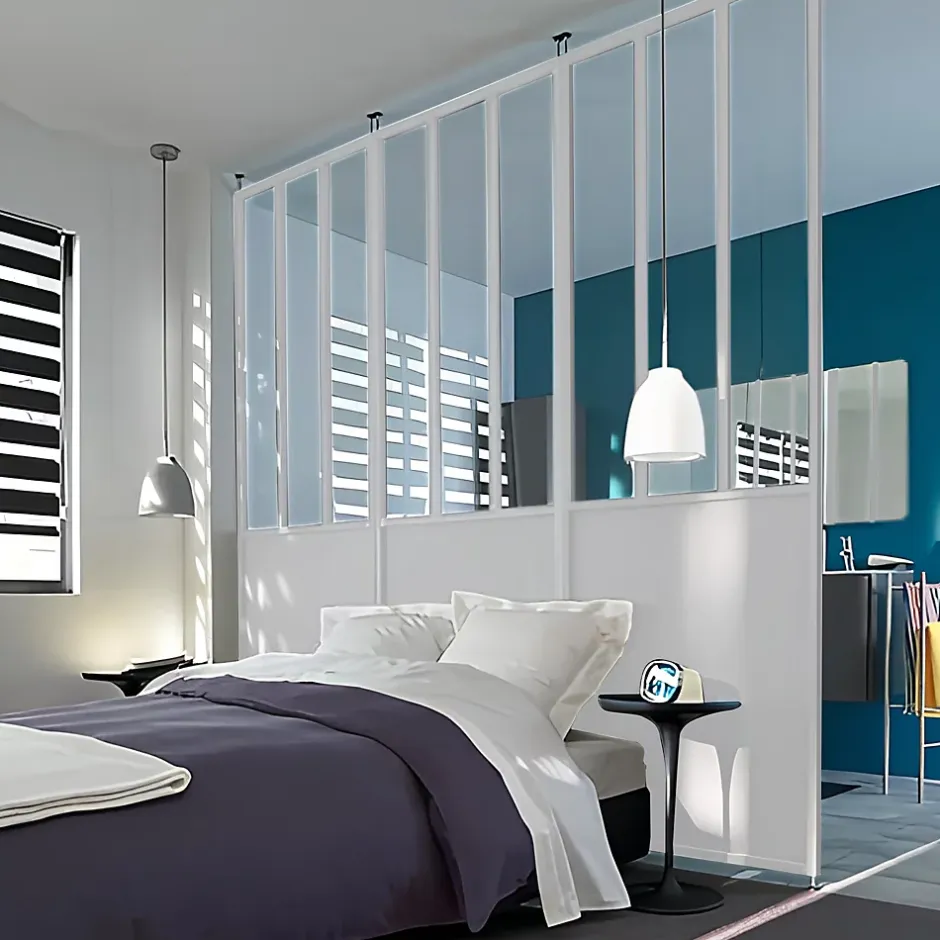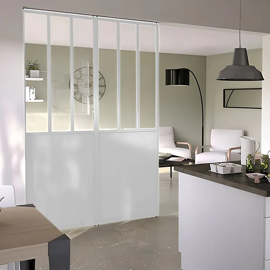 Vous souhaitez créer une séparation entre deux espaces sans perdre l’effet de profondeur et de perspective de votre pièce ? Avec ses grands vitrages et son corps en aluminium, cette cloison blanche 3 en 1 est facile à installer grâce à son système de pieds réglables ne nécessitant aucun perçage.