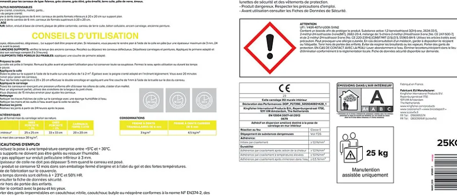 - CLASSEMENT POUR LES ÉMISSIONS DANS L’AIR INTÉRIEUR : A Information sur le niveau d’émissions de substances volatiles dans l’air intérieur, présentant un risque de toxicité par inhalation sur une échelle de classe allant de A+ (très faibles émissions) à C (fortes émissions)