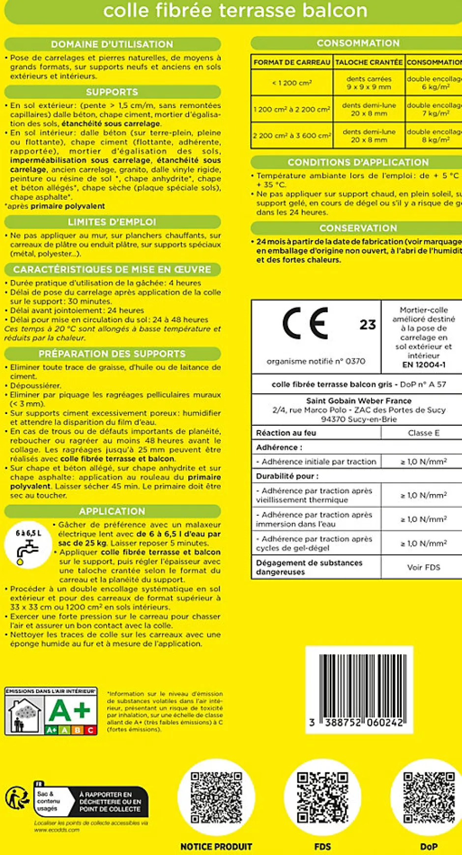 - CLASSEMENT POUR LES ÉMISSIONS DANS L’AIR INTÉRIEUR : A+ Information sur le niveau d’émissions de substances volatiles dans l’air intérieur, présentant un risque de toxicité par inhalation sur une échelle de classe allant de A+ (très faibles émissions) à C (fortes émissions)