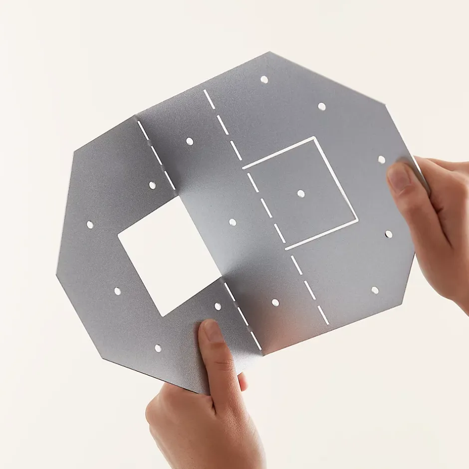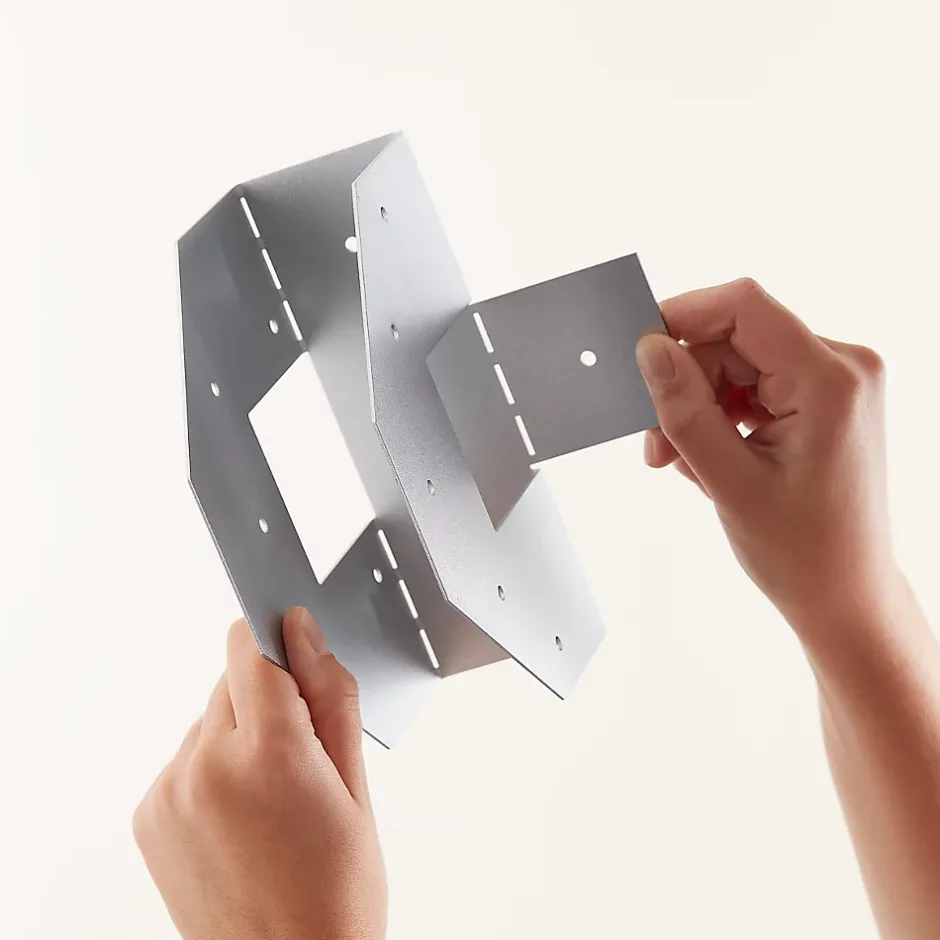 - Pliez le connecteur le long des lignes perforées, insérez l’élément en bois dans le connecteur et fixez-le avec des vis