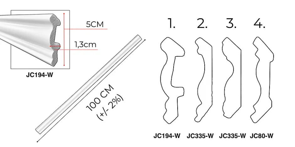 Materiau PS de haute qualite : Fabriquees en materiau PS robuste et resistant aux chocs, les moulures sont durables, stables, impermeables et peuvent etre peintes. Ideales pour la decoration des murs et des plafonds dans les pieces de vie, couloirs, chambres ou bureaux.Dimensions precises et bords nets : Chaque moulure mesure 100 cm de long (+/- 2 %), avec des bords de profil bien definis pour des raccords parfaits. Disponibles en quatre designs elegants – du classique au moderne – pour une decoration personnalisee.Montage facile sans percer : Les moulures se collent simplement avec un adhesif de montage – sans vis ni clous. Parfait pour les bricoleurs – rapide, propre et durablement esthetique.Decoupables et adaptables : Les moulures en PS se decoupent facilement avec une scie a onglets ou une petite scie manuelle. Pour les angles – interieurs ou exterieurs – une coupe a 45 degres est recommandee pour des raccords parfaits.Faciles a entretenir et durables : Grace a leur surface impermeable, ces moulures conviennent egalement pour les cuisines et salles de bain. Le materiau est stable en couleur, resistant a la temperature et facile a nettoyer – ideal pour une decoration durable et impeccable.