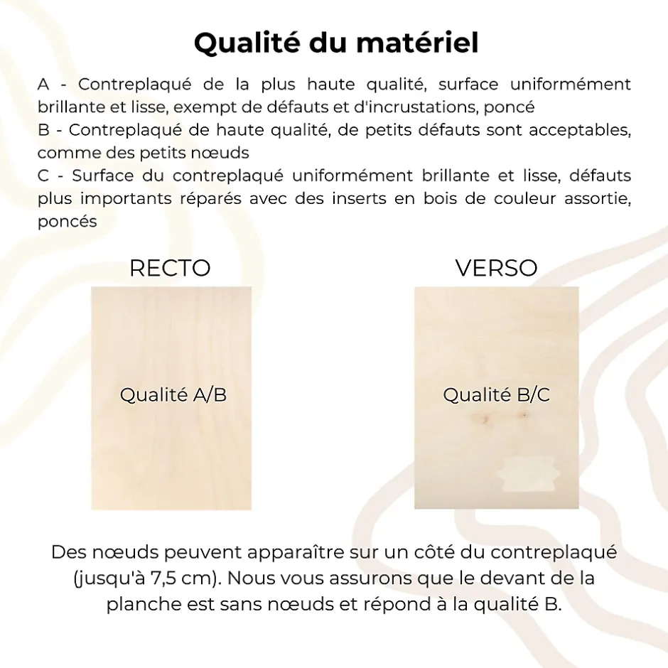 TAILLE IDÉALE – Chaque plaque a approximativement le format d’une feuille de papier A4. La longueur et la largeur du panneau ont une tolérance de +/-2 mm. Parfait pour du bricolage, du vernissage, des projets DIY, de la pyrogravure, des maquettes, du découpage, ou de la pyrogravure.BOIS CLASSE B/B – Nos planches se distinguent par une surface lisse et polie, garantissant au moins une face exempte de défauts. L’autre face peut contenir des défauts réparés d’une taille maximale de 6 cm. Dans certains cas, la face avant peut répondre aux normes de qualité de la classe A au lieu de B, et la face arrière aux normes de la classe C au lieu de B. Tous nos panneaux sont soigneusement vérifiés manuellement, ce qui permet de minimiser les défauts et de garantir la plus haute qualité.USAGE MULTIPLE – Les panneaux de contreplaqué peuvent être utilisés pour de nombreux projets d’artisanat. Vous pouvez faire de belles gravures, des ornements, des découpes et bien plus encore, comme de jolies décorations comme des planches avec des noms, des formes différentes, des signes pour des occasions telles qu’un anniversaire, Noël, Pâques, un baptême ou des enseignes de porte – il y a de nombreuses possibilités !DÉFORMATIONS RARES – Si la plaque se déforme accidentellement, mouillez le côté concave et séchez le côté convexe. Utilisez une éponge ou un pulvérisateur pour humidifier le côté concave du contreplaqué (eau chaude). Ensuite, posez la planche côté humide vers le bas sur le sol pour 2 jours.FABRIQUÉ DANS L’UE – Nous nous procurons nos produits dans l’Union européenne, qui applique certaines des normes les plus élevées au monde. C’est pourquoi, nous pouvons garantir une haute qualité de nos produits à nos clients. Nos produits sont fabriqués à partir de matériaux naturels et non toxiques.