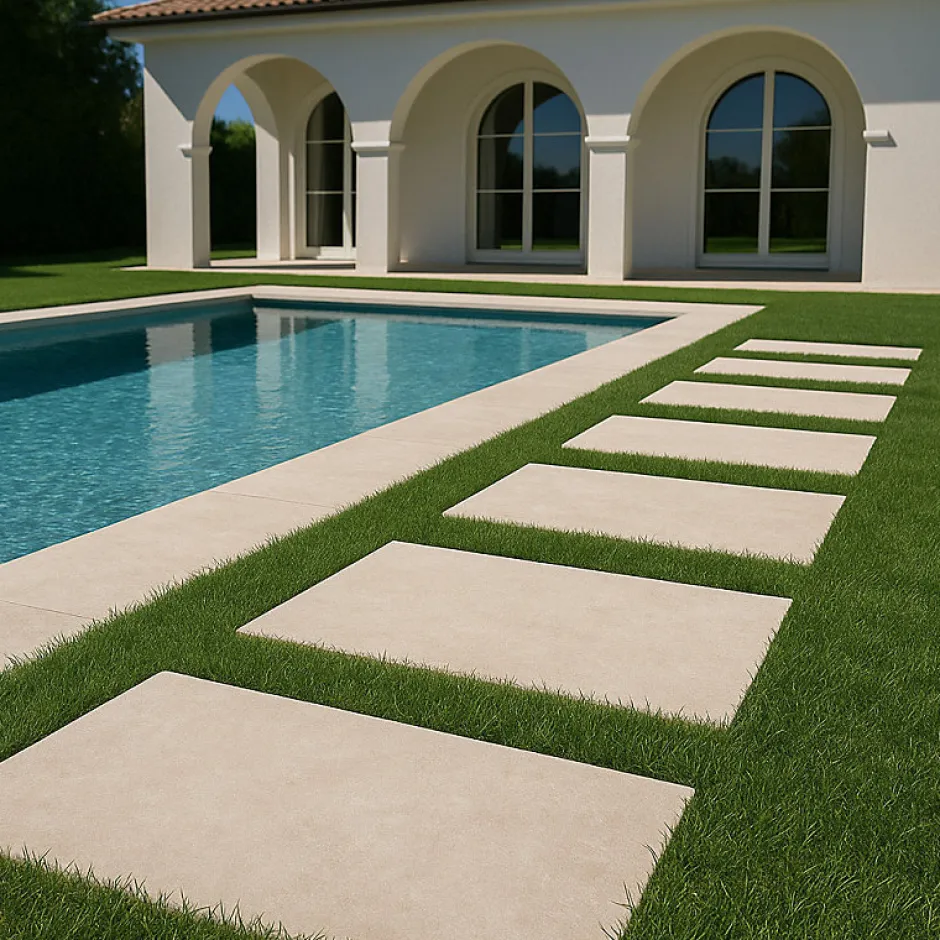 Matière: Grès Cérame Dimensions: 60 x 90 cm Usage: Extérieur Destination: Sol & Mur Finition: Antidérapant R11 Rectifié: Oui Epaisseur: 20 mm Nuance : Peu nuancé V2 Existe en: 60×120 cm intérieur / Extérieur: 60×120 cm, 40×60 cm + DALLE 60×90 cm 20 MM. . Série Pierre de Travertin Élégance intemporelle et sobriété naturelle, La série Pierre de Travertin réinterprète la beauté authentique de la pierre naturelle à travers un grès cérame raffiné et minimaliste. Son léger nuançage lui confère un style naturel et harmonieux, parfait pour les ambiances épurées et contemporaines. Cette collection complète s’adapte à tous les espaces et usages : Intérieur & extérieur : format 60×120 cm Extérieur : formats 60×90 cm et 40×60 cm Dalle effet pierre 20 mm : format 60×90 cm pour terrasses, allées ou abords de piscine Éléments spéciaux : margelles assorties pour une finition élégante et cohérente Alliant esthétique naturelle, polyvalence et résistance, la série Pierre de Travertin offre une solution complète et durable pour sublimer vos espaces avec simplicité et élégance. N’hésitez pas à nous contacter pour demander un échantillon. .