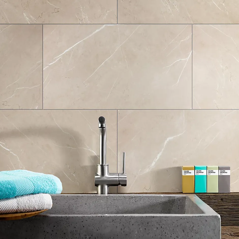 - Avec les dalles de Dumawall+, carreler devient un jeu d’enfant. Le format convivial peut être découpé sur mesure à l’aide d’une scie normale. La pose se fait en un rien de temps