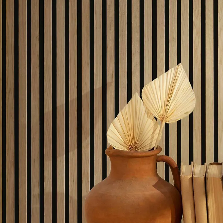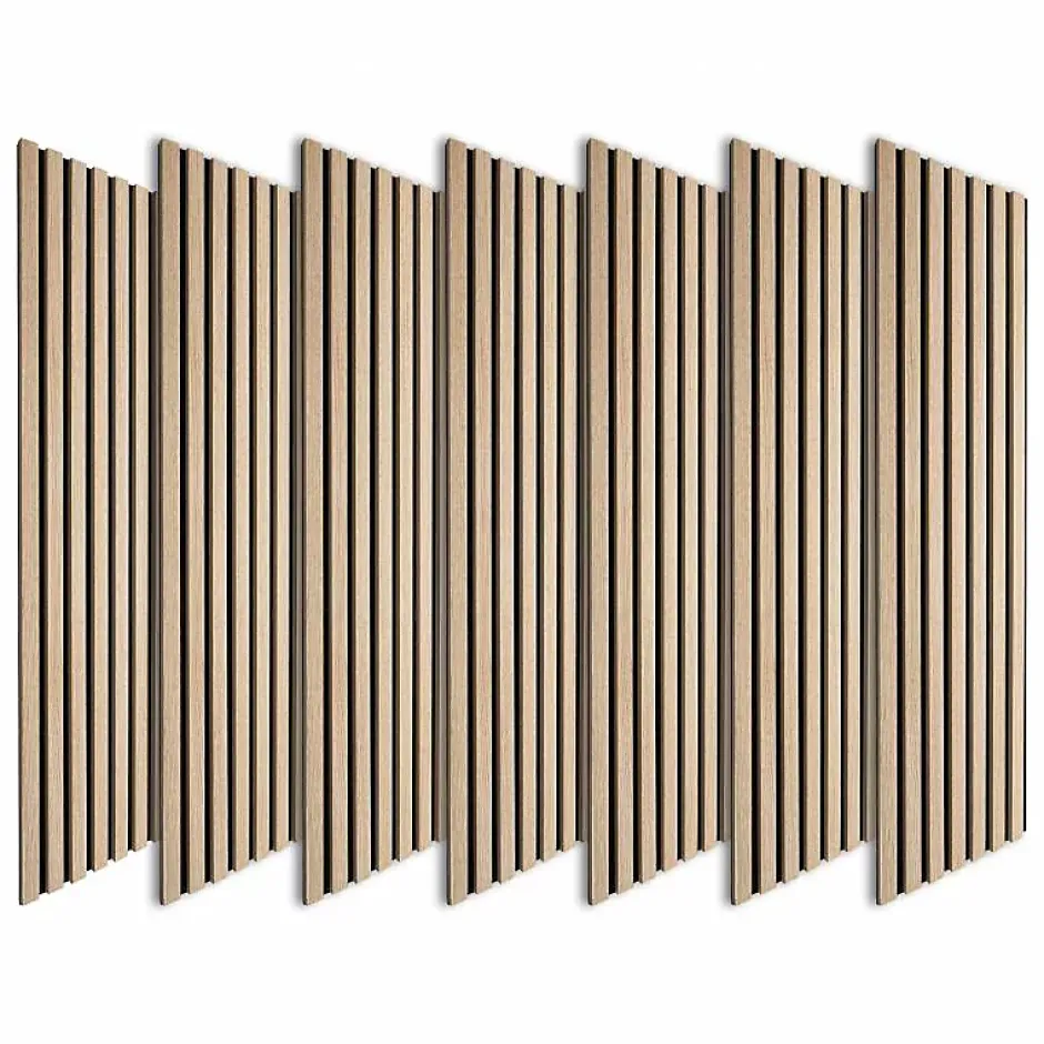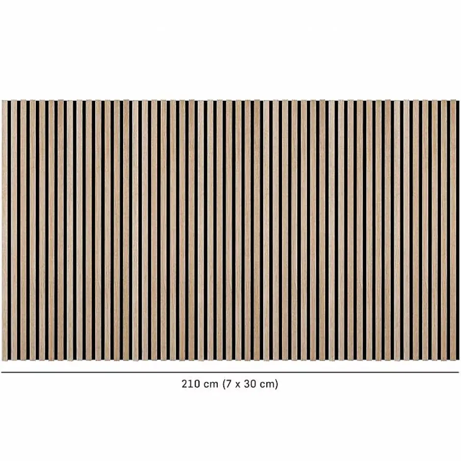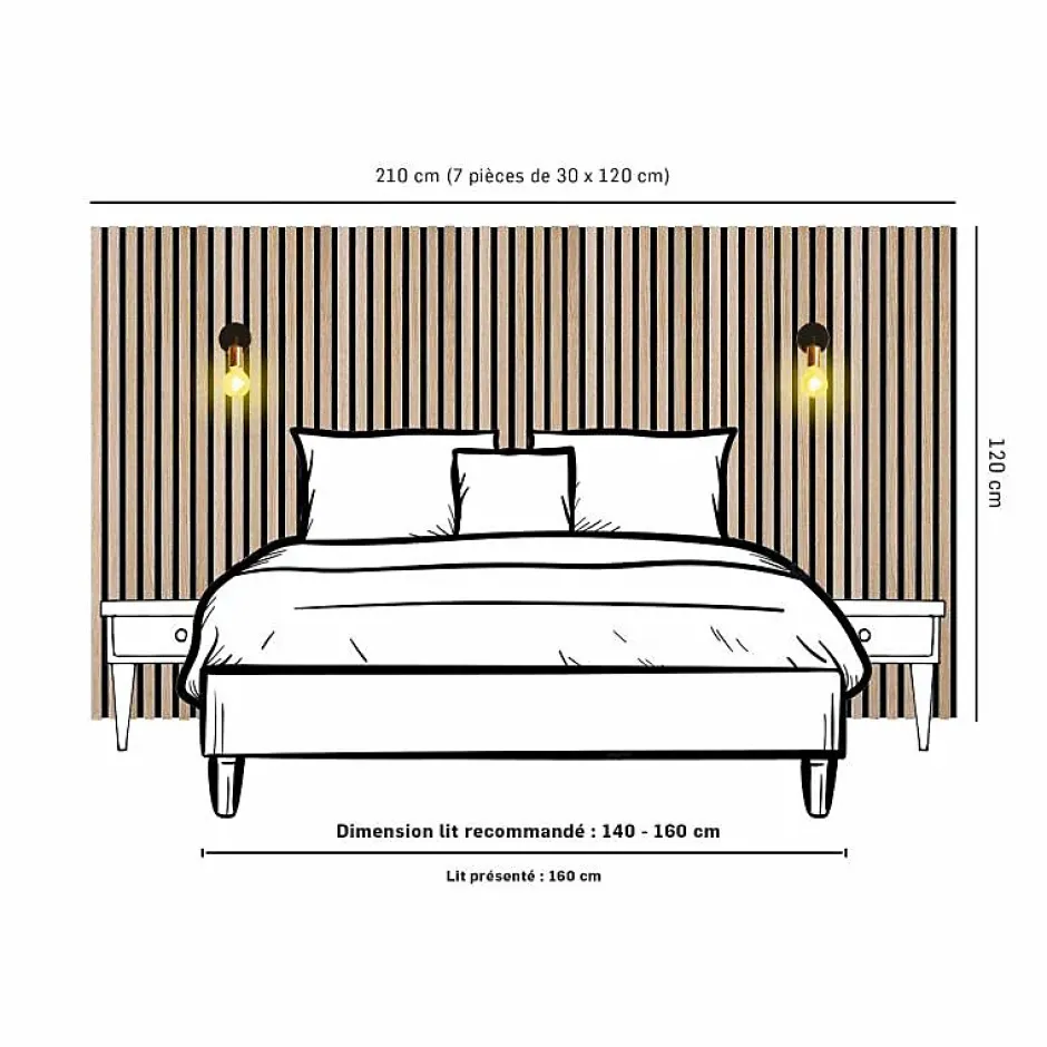 Tête de lit tasseau pour lit 160 cmCe pack tête de lit 160 tasseaux verticaux a été spécialement conçu pour équiper un lit de largeur 160 cm. Il est composé de 7 panneaux tasseaux bois de hauteur 120 cm pour une largeur totale de 210 cm. Ce qui laisse un débordement de 25 cm de part et d’autre du sommier.Ce pack de panneaux tasseaux conviendra également en tête de lit pour lit 140 ou 180 cm. La largeur du débordement variera en fonction.Présentation du panneau tasseau pour tête de litLe panneau tasseau bois 120 est composé d’une feutrine noire en polyester de 4 mm d’épaisseur sur laquelle sont agrafés des tasseaux en MDF revêtus d’un chaleureux placage en chêne clair. Ces tasseaux chêne de section 27 x 6 mm sont espacés les uns des autres de 16 mm. L’ensemble des 7 panneaux constitue un pack tête de lit de largeur totale de 210 cm.Avantages du pack tête de lit 160 tasseaux verticaux- Avec sa finition chêne naturel contrastant à la feutrine noire, c’est la tendance déco actuelle.- La composition des tasseaux déco vous assure une bonne stabilité dans le temps et un rendu impeccable.- Facile à poser, les panneaux décoratifs se collent directement sur le mur.- En sélectionnant ce pack tete de lit 160, aucune coupe n’est à prévoir.