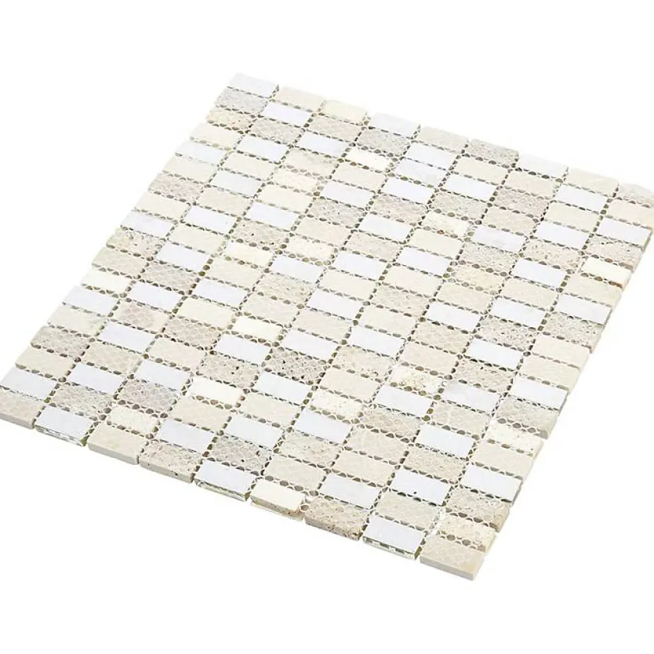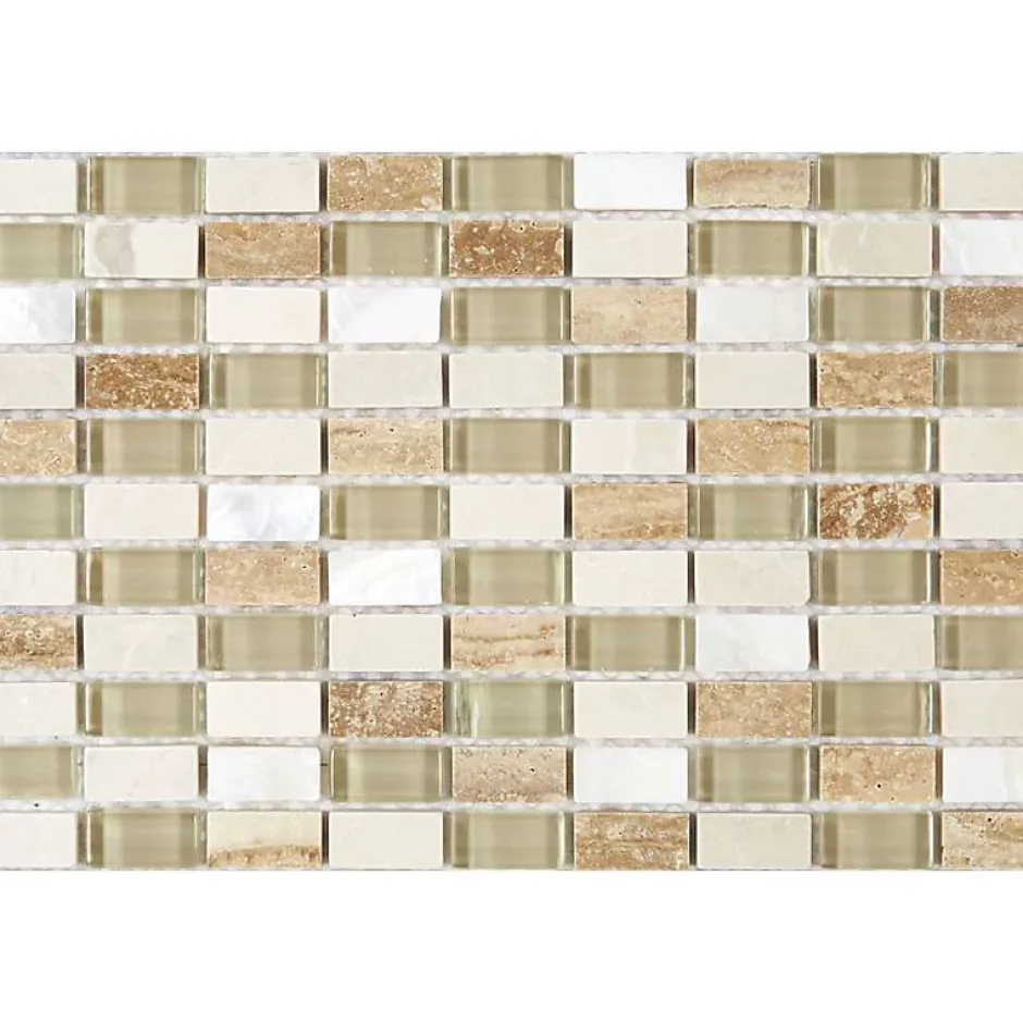 Composée de tesselles rectangulaires, la mosaïque s’adapte à tous les styles de décoration. Facile à poser, elle permet de laisser cours à sa créativité. Fabriquée en pierre et en verre de couleur beige, la plaque de mosaïque convient aux pièces sèches et humides. Idéale pour transformer son intérieur, elle s’utilise dans une salle de bains, une cuisine, un spa ou une entrée. Ajoutant du cachet à la décoration, le verre restitue la lumière et la pierre instaure une ambiance relaxante et naturelle.