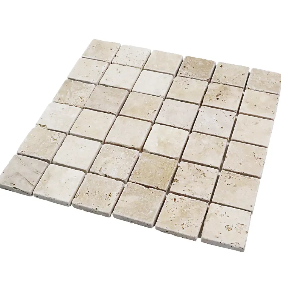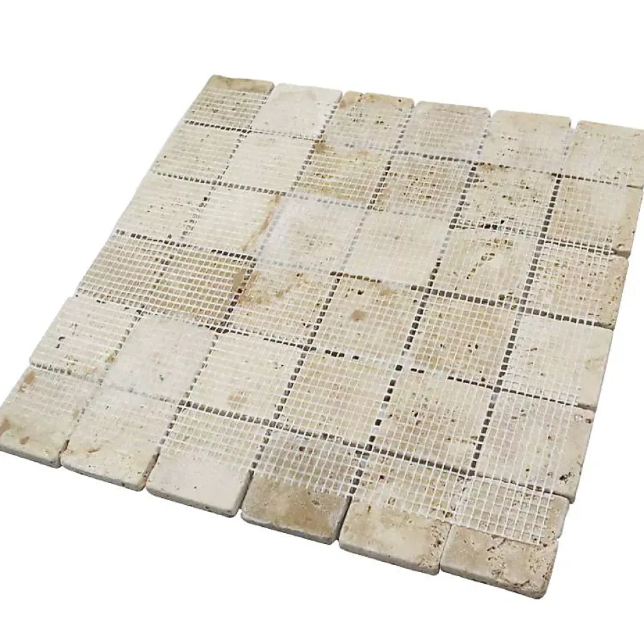 De couleur claire, la mosaïque travertin est constituée de petits carreaux de 4.8 x 4.8 centimètres. De forme carrée, il est nécessaire d’utiliser 11 plaques pour recouvrir une surface de 1 m².Apportant du cachet à la décoration d’une pièce, la plaque de mosaïque en pierre vieillie est idéale pour habiller un mur de la salle de bains ou pour réaliser une crédence dans la cuisine. Permettant également de personnaliser votre intérieur, elle se marie avec tous les styles de décoration.