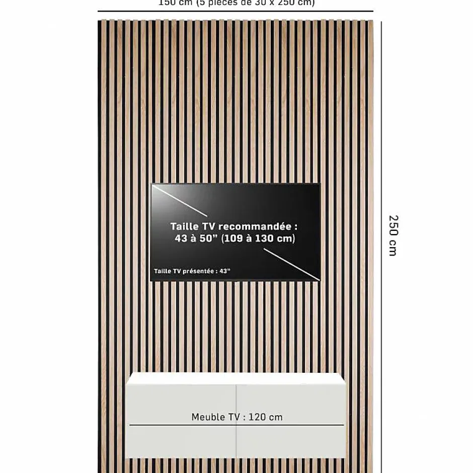 Le pack idéal pour créer un mur TV de 150cm (pour les téléviseurs de 50″ ou moins)Le mur en tasseau de bois est l’une des dernières tendances dans le monde de la décoration d’intérieur. De plus en plus apprécié par les amateurs de home staging ou les architectes, ils sont désormais accessibles pour tous les amateurs de déco afin de créer un mur TV, une entrée moderne et chic, une tête de lit cocooning ou simplement pour donner une ambiance scandinave design dans votre intérieur.Decoon vous propose une solution tout-en-un, prête à poser, pour créer votre mur TV de dimension 250 x 150 cm (3,75m² de tasseaux) ! Pour réaliser vous même votre mur télévision insonorisé tout en décorant votre intérieur, les panneaux muraux enrichiront votre salon grâce à son design unique et son effet acoustique. Cette solution de 250 x 30cm d’une épaisseur de 1cm est la solution idéale pour moderniser rapidement et facilement votre intérieur. En un rien de temps, vous apporterez du cachet à votre salon tout en créant un décor en tasseaux cosy et chaleureux.Nous recommandons ce pack produit de 5 panneaux de tasseaux de bois pour les téléviseurs de maximum 50″ (130cm). Il existe d’autres packs mur TV chez Decoon pour les téléviseurs plus grands, comme la solution pour les TV de 55″ maximum. Vous pouvez également acheter vos lamelles bois à l’unité, de dimension 250 x 30cm.Présentation du panneau tasseau boisCe panneau est composé d’une feutrine noire et de lattes de bois espacées. Il présente une épaisseur totale de 1 cm : 8 mm d’épaisseur de feutrine