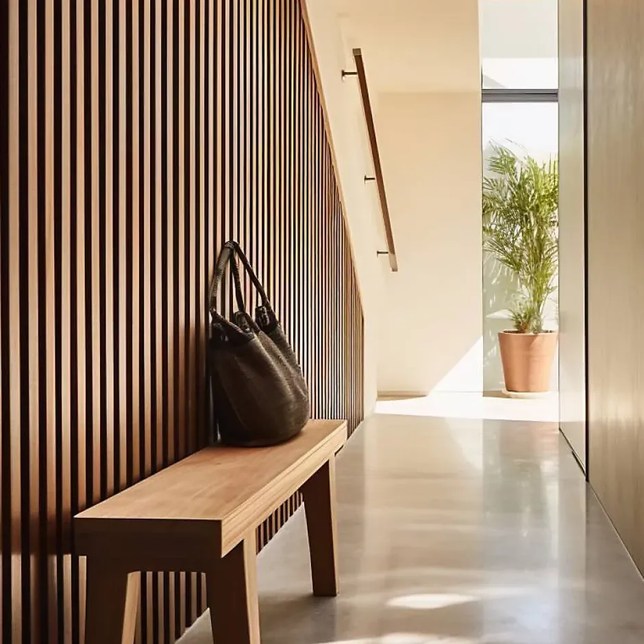 Vous souhaitez apporter de la structure à vos murs tout en conservant un aspect naturel ? Découvrez nos panneaux 3D en tasseaux bois. A la fois tendance et intemporel, ce claire voie intérieur.Ce panneau mural de 250 centimètres de hauteur est composé de tasseaux de 3.8 cm d’épaisseur assemblés sur un fond en bois rigide.Grâce à ces tasseaux très épais, l’effet de profondeur et le rendu de ce claire voie intérieur est fantastique !Sur un mur entier ou par touche, c’est l’incontournable atout déco qui apportera de l’élégance à vos pièces. Effet > garanti !Présentation du panneau tasseau bois intérieurCe revêtement mural de très belle finition est constitué d’une plaque en fibre de bois haute densité de couleur noire sur laquelle sont agrafés des tasseaux en MDF revêtus d’un placage chêne. Ce panneau bois intérieur mesure 250 cm de hauteur, 18 cm de largeur et 4 cm d’épaisseur. Les tasseaux présentent une section de 27 mm de large pour 38 mm de profondeur.Ce bardage vertical est exclusivement réservé à la décoration intérieure (hors pièces humides et sources de chaleur).Avantages du panneau de tasseaux bois- La finition de ce panneau est très qualitative. La large profondeur des tasseaux donne à ce panneau 3D un rendu incomparable. Celui-ci est d’ailleurs accentué par le contraste entre le placage chêne clair et le fond noir.- Contrairement aux tasseaux traditionnels qu’il faut fixer un à un, le panneau 3D se colle directement au mur et s’adapte facilement à tous les intérieurs.- La pose est également facilitée par la conception astucieuse de ce panneau de tasseaux. Les panneaux décoratifs s’assemblent les uns avec les autres grâce à un système de raccord invisible.