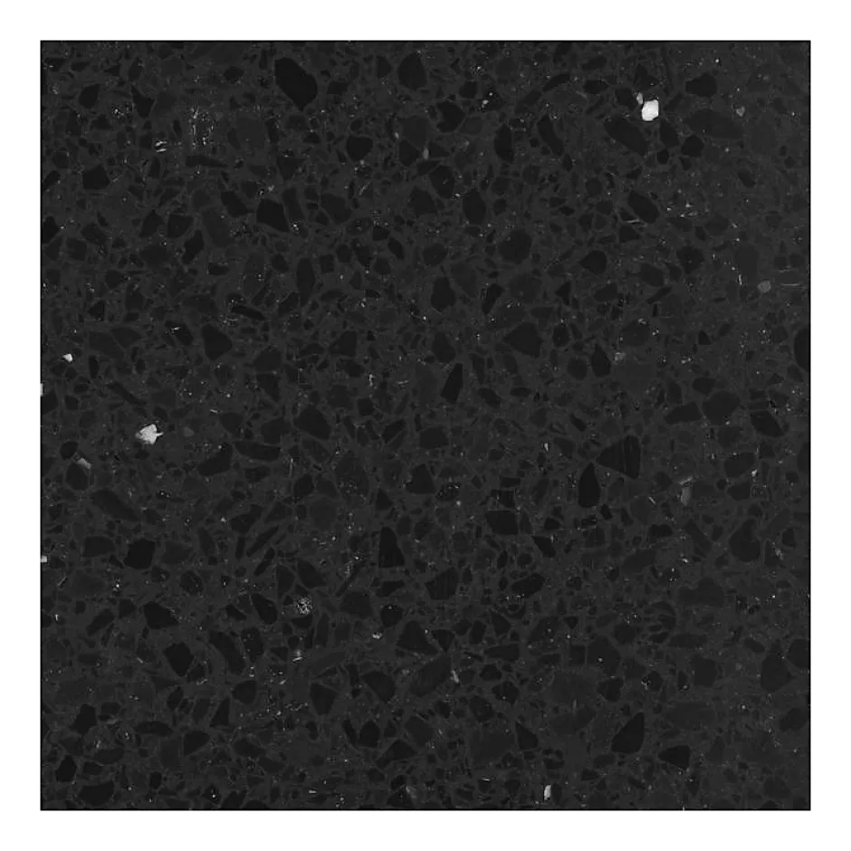 Ce carrelage en terrazzo véritable est un carré de 60 cm de côté et d’épaisseur 2 cm. Cette dalle robuste arbore une finition mate. Les bords sont rectifiés (angles saillants). Ce terrazzo noir est incrusté d’éclats de noir et quelques subtiles touches de blanc.- Chaque carreau a un aspect unique.- Le terrazzo est très résistant à l’usure.- Il est facile à entretenir.- Contrairement au terrazzo coulé sur place, le carrelage terrazzo est stable (pas de risque de fissure).Il peut être nécessaire de nettoyer la surface lisse de la dalle de terrazzo afin qu’elle retrouve tout son éclat et sa couleur d’origine. Pour un résultat optimal, nous recommandons d’utiliser une éponge abrasive (côté vert) associée à un produit nettoyant adapté, en frottant la surface de manière régulière et énergique. N’hésitez pas à laisser sécher, puis à répéter l’opération deux à trois fois si nécessaire.