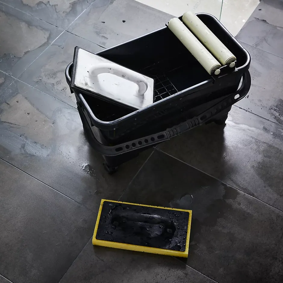 Ce kit de nettoyage de joint 3 pièces Diall contient les outils requis pour réaliser facilement vos projets de joints de carrelage : 1 seau extra large sur roues avec 2 rouleaux pour essorer la taloche éponge et une grille en plastique pour l’eau propre, 1 taloche pour étaler le joint frais, 1 taloche éponge pour nettoyer le surplus de joint sur les grandes surfaces carrelées