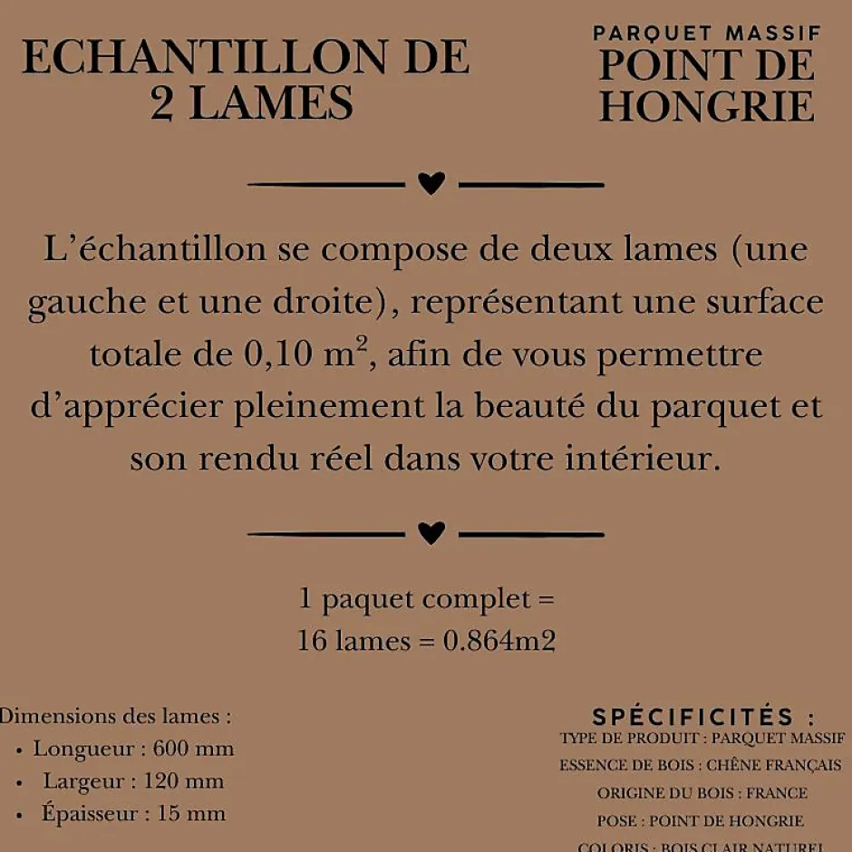 [ECHANTILLON] – 2 lames Ce parquet massif en chêne français, issu de bois noble et durable, séduit par son authenticité et sa qualité haut de gamme. Sa pose en pointe de Hongrie (chevron) apporte un caractère élégant et intemporel, parfaitement adapté aux intérieurs classiques comme contemporains. Les lames de 600 × 120 mm pour 15 mm d’épaisseur sont biseautées et coupées à 45 , garantissant une pose régulière et précise. Le bois massif offre une bonne stabilité dimensionnelle et convient aux pièces de vie, salons et chambres. La finition naturelle révèle une teinte bois clair à blond chaud, avec un veinage apparent et des variations naturelles propres au chêne. La pose collée en plein est recommandée (pose clouée possible selon support). Parquet massif non compatible avec le chauffage au sol. Tolérance de fabrication ?5 %. 1 paquet = 16 lames = 0.864m2 2 lames = 0,108 m ?Caractéristiques et avantages