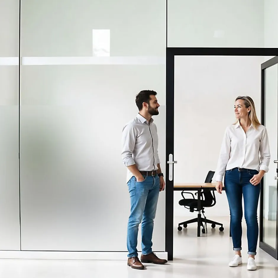 - Film dépoli pour vitrage – Idéal pour lutter contre le vis-à-vis et permet de cacher des regards indiscrets, tout en laissant passer la lumière.