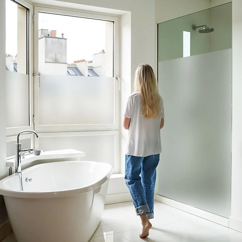 - Film dépoli pour vitrage – Idéal pour lutter contre le vis-à-vis et permet de cacher des regards indiscrets, tout en laissant passer la lumière.