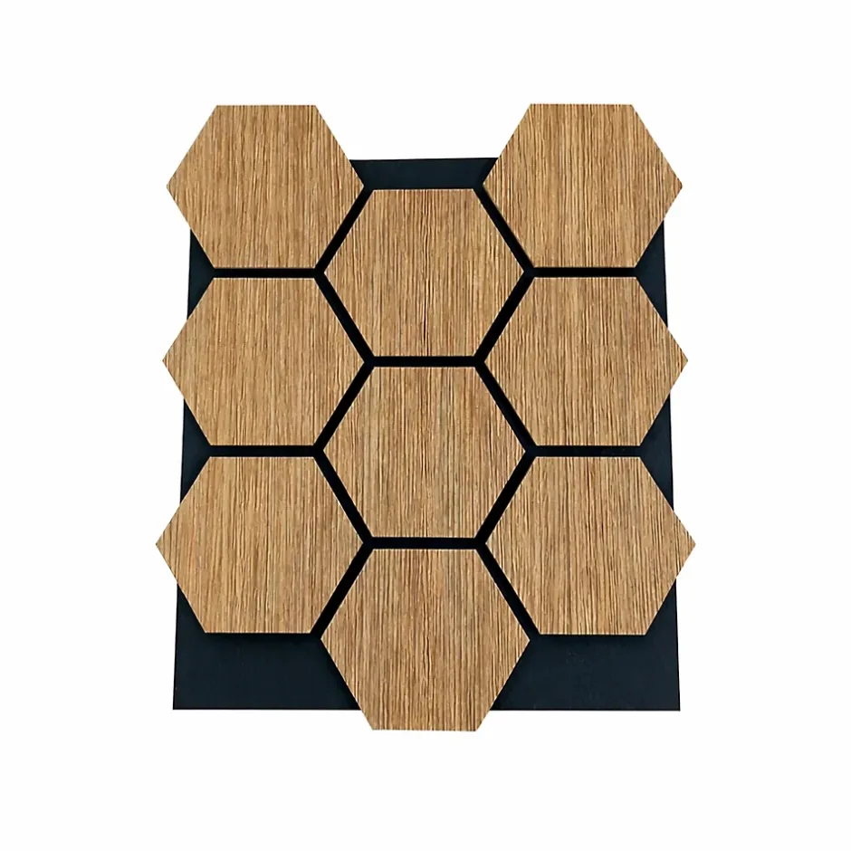 DIVINA HOME – Panneau mural acoustique hexagonal en MDF et feutre PET, décoratif et insonorisant, 62,6 × 76,6 cm, 12 pièces par cartonCe panneau mural acoustique décoratif, au design hexagonal effet bois, est conçu pour améliorer le confort acoustique des pièces tout en apportant du caractère à vos murs. Solution alliant fonctionnalité et esthétique, il est idéal pour ceux qui recherchent un revêtement moderne, modulable et visuellement saisissant.Sa structure associe une base en feutre PET insonorisant à une surface en MDF effet bois. Cette combinaison réduit efficacement l’écho et la réverbération, absorbant jusqu’à 75 % de l’énergie sonore, tout en conservant un aspect chaleureux et contemporain. Il en résulte un environnement plus calme, plus équilibré et plus agréable à vivre ou à travailler.Sa forme hexagonale permet de multiples compositions, s’adaptant à tous les styles et à tous les espaces. Les panneaux peuvent être disposés de manière linéaire ou créative, devenant ainsi un véritable élément décoratif. Ils conviennent donc parfaitement aux habitations, mais aussi aux bureaux, studios professionnels, salles de réunion et espaces commerciaux.Chaque panneau mesure 62,6 × 76,6 cm et a une épaisseur totale de 1,3 cm. Il est composé de 0,5 cm de feutre PET et de 0,8 cm de MDF. Les matériaux sont légers et résistants, faciles à manipuler et à installer. Ils peuvent être fixés par collage ou vissage, ce qui simplifie le montage, même pour les bricoleurs. De plus, les panneaux peuvent être découpés et façonnés pour s’adapter à des besoins spécifiques ou à des surfaces atypiques.Le paquet contient un carton de 12 panneaux muraux hexagonaux, conçus pour offrir une couverture modulaire et personnalisable