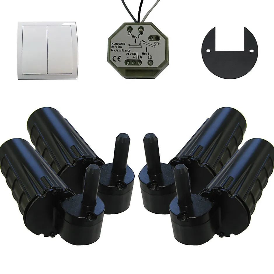 Double motorisation invisible Ø 12 mm pour volet battant Commande filaire avec interrupteur Pour 2 vantaux gauche et droite Poids max du vantail : 60 kg Fabriqué en France Garantie : 2 ans Quantité : 4 Attention : Volet non compris dans le kit, ni l’alimentation 24V, ni le kit résine. Double motorisation encastrée pour volets 2 battants URANUS filaire – gond Ø 12.Nos produits URANUS double motorisation sont à utiliser pour des volets de grande surface (voir spécifications techniques dans la notice de pose).Motorisez vos volets battants en toute discrétion, en préservant le cachet de votre façade, grâce au système innovant de gond motorisé encastré directement dans le mur.Les motorisations URANUS s’adaptent sur tous types de volets battants (bois, PVC, aluminium…), en neuf ou en rénovation.Associé à ce produit, nous recommandons l’utilisation de pentures d’épaisseur 5 mm minimum , en acier ou inox.Pour plus de détails, consultez la notice de pose. Spécifications à respecter : – Largeur du vantail : 30 cm min / 90 cm max- Surface max du vantail : 2 m²- Poids max du vantail : 60 kg- Distance min axe du gond / bord du volet : 30 mm- Épaisseur min penture (acier ou inox) : 5 mm Description : – Discret : un système de gond motorisé totalement invisible.- Sécurisant : détection d’obstacle selon la norme NF 26-341.- Souplesse d’utilisation : pilotez l’ouverture de l’ensemble ou une partie de vos volets.- Neuf ou rénovation : s’adapte sur tous types de volets battants y compris sur vantaux liés avec notre compas multivantaux. – Produit conçu et fabriqué dans nos ateliers en France, testé unitairement et garanti 2 ans. Contenu du kit : – 2 moteurs droits + 2 moteurs gauches (vu d