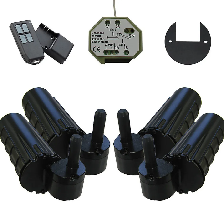 Double motorisation invisible Ø 12 mm pour volet battant Commande radio avec télécommande Pour 2 vantaux gauche et droite Poids max du vantail : 60 kg Fabriqué en France Garantie : 2 ans Quantité : 4 Attention : Volet non compris dans le kit, ni l’alimentation 24V, ni le kit résine. Double motorisation encastrée pour volets 2 battants URANUS radio – gond Ø 12.Nos produits URANUS double motorisation sont à utiliser pour des volets de grande surface (voir spécifications techniques dans la notice de pose).Motorisez vos volets battants en toute discrétion, en préservant le cachet de votre façade, grâce au système innovant de gond motorisé encastré directement dans le mur.Les motorisations URANUS s’adaptent sur tous types de volets battants (bois, PVC, aluminium…), en neuf ou en rénovation.Associé à ce produit, nous recommandons l’utilisation de pentures d’épaisseur 5 mm minimum , en acier ou inox.Pour plus de détails, consultez la notice de pose. Spécifications à respecter : – Largeur du vantail : 30 cm min / 90 cm max- Surface max du vantail : 2 m²- Poids max du vantail : 60 kg- Distance min axe du gond / bord du volet : 30 mm- Épaisseur min penture (acier ou inox) : 5 mm Description : – Discret : un système de gond motorisé totalement invisible.- Sécurisant : détection d’obstacle selon la norme NF 26-341.- Souplesse d’utilisation : pilotez l’ouverture de l’ensemble ou une partie de vos volets. – Neuf ou rénovation : s’adapte sur tous types de volets battants y compris sur vantaux liés avec notre compas multivantaux. – Produit conçu et fabriqué dans nos ateliers en France, testé unitairement et garanti 2 ans. Contenu du kit : – 2 moteurs droits + 2 moteurs gauches (vu de l