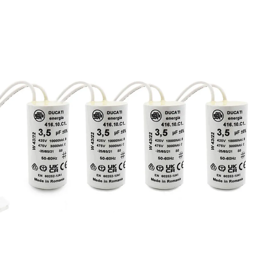 Caractéristiques techniques :- Capacité : 3,5 uF (Microfarad)- Tension : 425V à 475V AC- Tolérance : 5%- Matériau : Plastique grisDimensions :- Longueur (sans connecteurs) : 50 mm- Diamètre : 25 mm- Longueur des fils : 115 mm- Type de Connexion : Connecteurs, sans vis- Conformité : Certifié CE pour une utilisation en toute sécurité